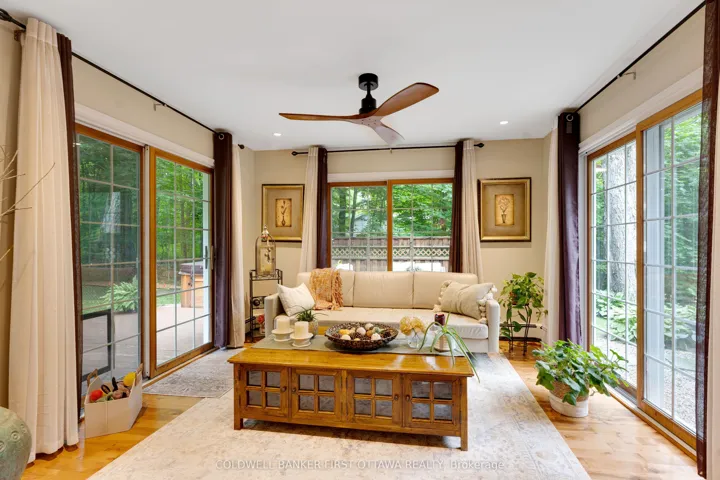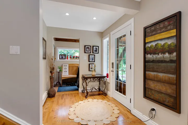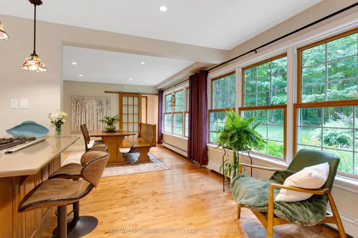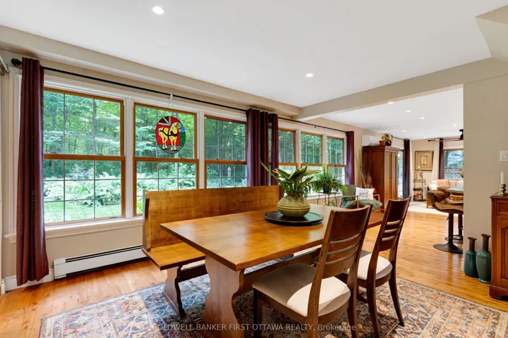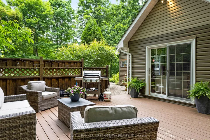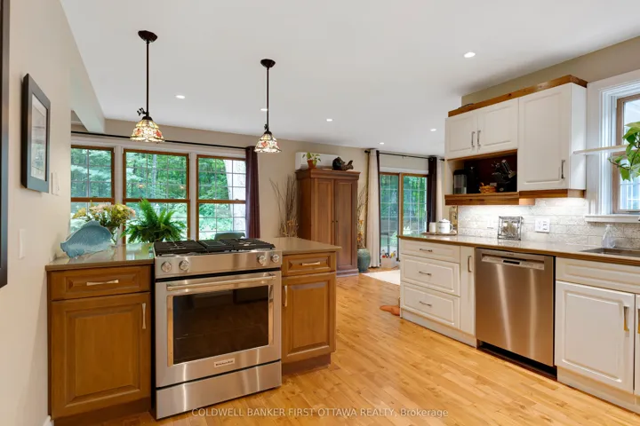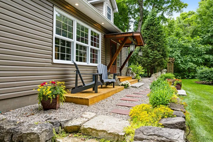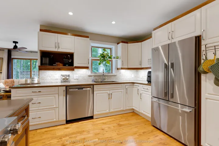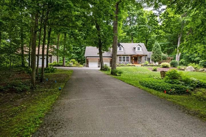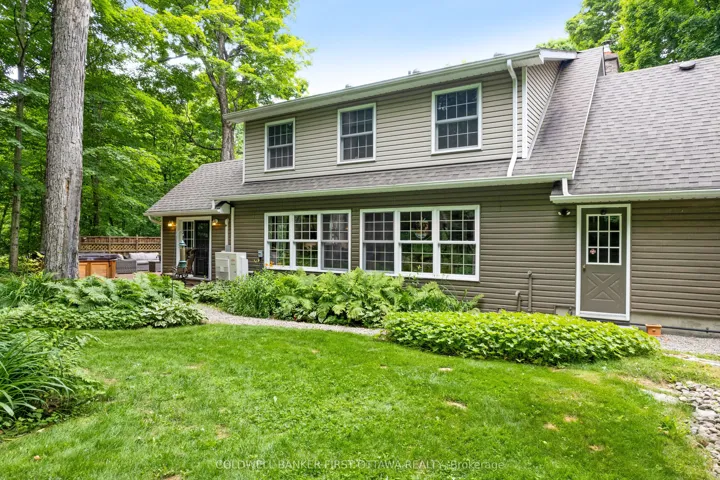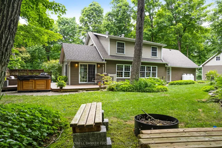 +"PublicRemarks": "Loving where you live is effortless, here in irresistible Cape Cod home with landscaped gardens blending into the surrounding tranquility. On private acre that feels like a park, three bedroom home with attached double garage and detached double garage-workshop. Home's front walkway has deck ideally designed for quiet times, watching perennials bloom and birds sing. Light-filled foyer adjacent to coat room with large windows. Open floor plan offers defined family spaces; never-ending walls of windows, maple floors and 8' ceilings with high-end recessed lights. Livingroom full of natural light flowing in from oversized windows and has stone fireplace with Jotul woodstove insert. Dining room wall of windows frame great outdoors. Contemporary 2022 kitchen with quartz counters, ceramic matte backsplash, island-breakfast bar, upscale appliances and Tiffany lights. Dinette has full-length windows giving you views of backyard oasis. Family room three sets of patio doors open to wrap-about deck with 2023 salt-water Artic Spa hot tub. Combined powder room & laundry station renovated 2024 with slate-like tile floor, decorative copper sink, custom wrap-about counter & shiplap ceiling. Mudroom door to garage and also door to yard. Upstairs, you have office/flex room. Sunny spacious primary bedroom deep window dormers with built-in bench and, walk-in closet with window. Two more large bedrooms, one with walk-in closet. Second floor bathroom a delight; all renovated 2023 with gorgeous custom vanity & luxury rain-head glass shower. Home has radiant hot water heating with wall radiators and 2025 propane boiler. Mini-split 2019 A/C. Hot water on demand 2025. Auto Generac can power whole home. Attached garage has epoxy floor & 240 V. Detached garage insulated, 250V, hoist, floor drains, windows & big loft. Hi-speed. Cell service. Located on paved township paved road with garbage pickup & school bus route. Just 4 mins to Lower Rideau Lake boat launch. 10 mins Smiths Falls or Perth."
