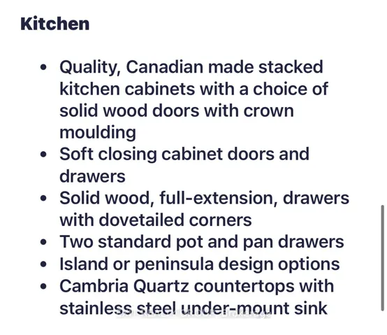 +"PublicRemarks": "Step into a brand-new bungalow from award-winning Staikos Homes in Caniff Mill Estates, Belleville. This all-brick, Maple model boasts luxurious finishes and is located on a quiet street. With 3 bedrooms, 2 bathrooms, and 1750 square feet, its a spacious and comfortable home. Featuring 9-foot ceilings, premium quartz counters throughout, and an attached double garage with an inside entry. The main floor includes a laundry room, a grand kitchen with high-quality ceiling cabinets, an island with storage, seating, and entertaining space. A great room with a gorgeous 10-foot tray ceiling, dining area features a patio door. Canadian made engineered oak or maple hardwood flooring cover the main floor areas, while premium porcelain tiles grace the front entrance, mudroom/ laundry room, and bathrooms. High quality carpet in the bedrooms with option to upgrade. The primary bedroom features a spacious walk-in closet and a stunning ensuite. Buyers have the freedom to make all interior selections and colours to suit their preferences. Conveniently located near all amenities, including the 401, great schools, parks, and river view walking trails."