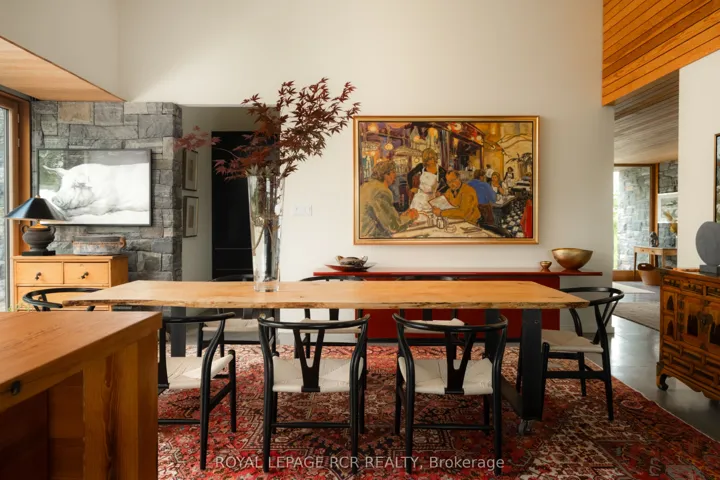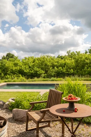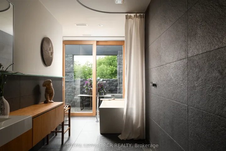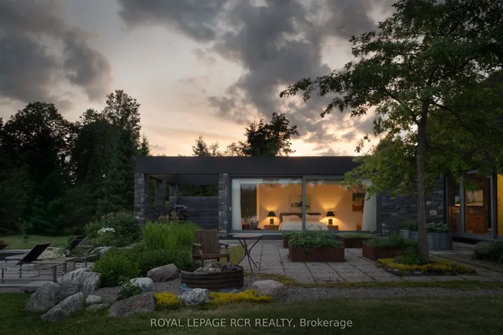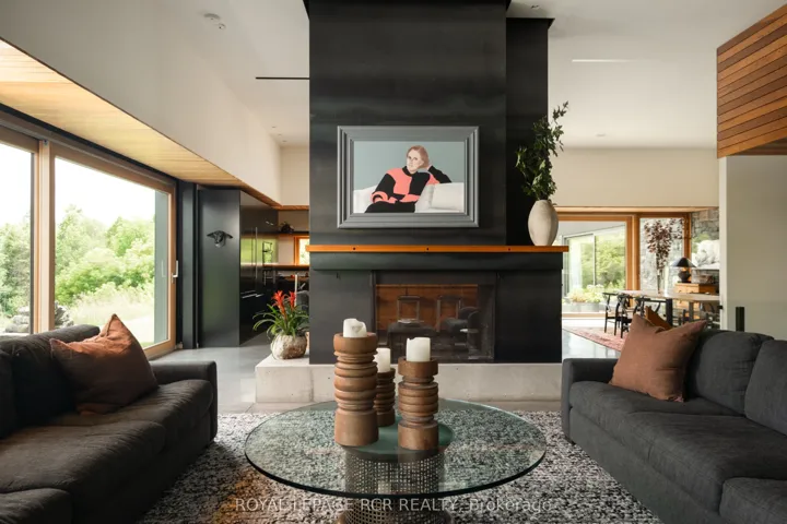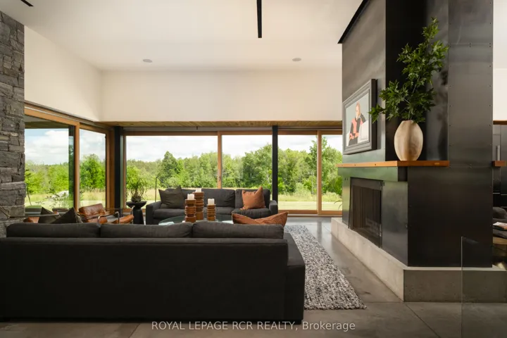 +"PublicRemarks": "A soulful modern residence designed to sync with the rhythm of the sun, offering incredible vistas from all spaces & making an effortless connection between indoors & out. Nestled on approx. 98 acres in the bucolic countryside of Erin, bordering Caledon, a long heritage stone wall lined driveway leads to a striking modern masterpiece. Surrounded by organic farmland & woodlands w/ acres of groomed trails, it's a rare find w/ a spectacular 40' pool overlooking the lush landscape & gardens. This remarkable large-footprint family home unfolds w/ a series of dynamic living spaces. 5 bedrooms, 6 bathrooms & over 8500 sq ft including the basement, it is defined by natural materials like heated concrete floors, douglas fir cladded ceilings & stone masonry. A fabulous balance of raw materiality w/ beauty & comfort. The kitchen & dining room are surrounded by glass, connecting the home to the properties incredible sunrises & sunsets. A handsome two-way focal fireplace is in the open-plan living area. The primary wing is a retreat w/ a spa-like ensuite, walk-in closet & a walkout to a garden terrace & the pool. On the other side of the home, several gorgeous sized bedrooms each w/ expansive windows & their own special view. The lower level is a world of its own w/ a separate entrance, home gym, additional family room, & workshop. A thoughtfully designed mudroom w/ custom lockers provides a discreet & organized hub for all gear, from equestrian to ski equipment. Two full baths, including a second primary suite w/ ensuite, create a sanctuary for family or guests. Advanced details include retractable Doepfner windows w/ low emissivity glazing, 6 zone radiant floor heating and central air, geothermal pumps for heating & cooling, PU-foamed wall cavities, commercial grade reflective membrane roof, & a propane powered generator w/ automatic switch. Magnificent in every way, a sanctuary of impeccable design, a place where artistry & comfort come together that truly inspires."
