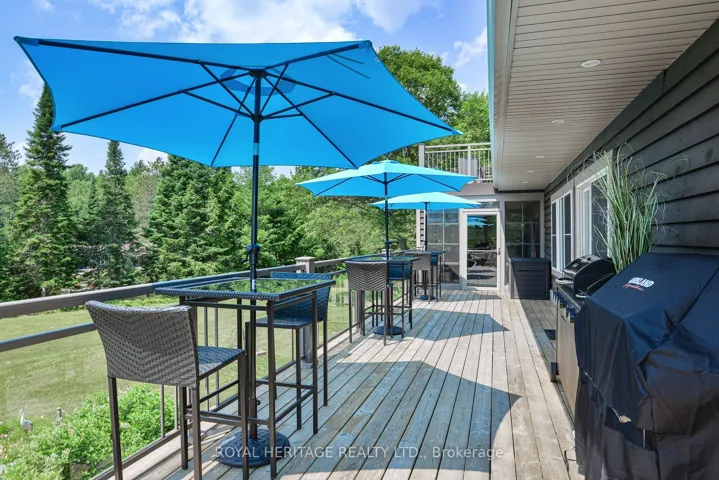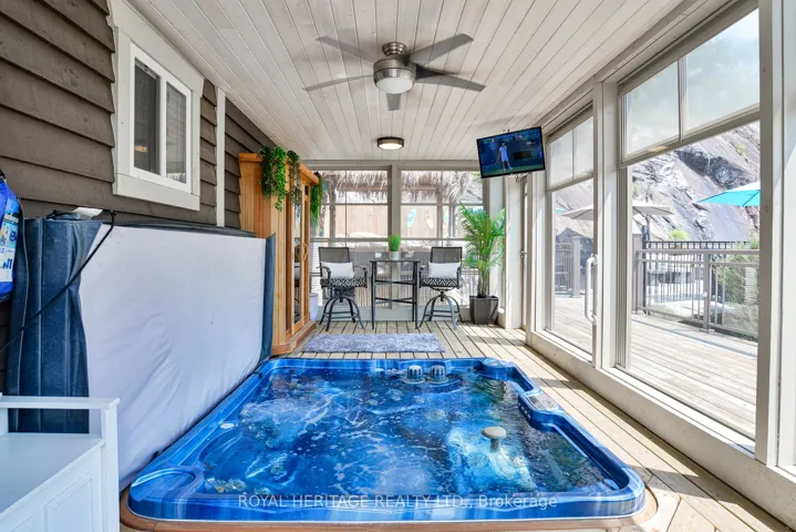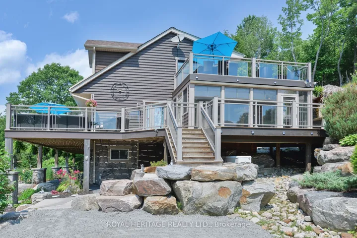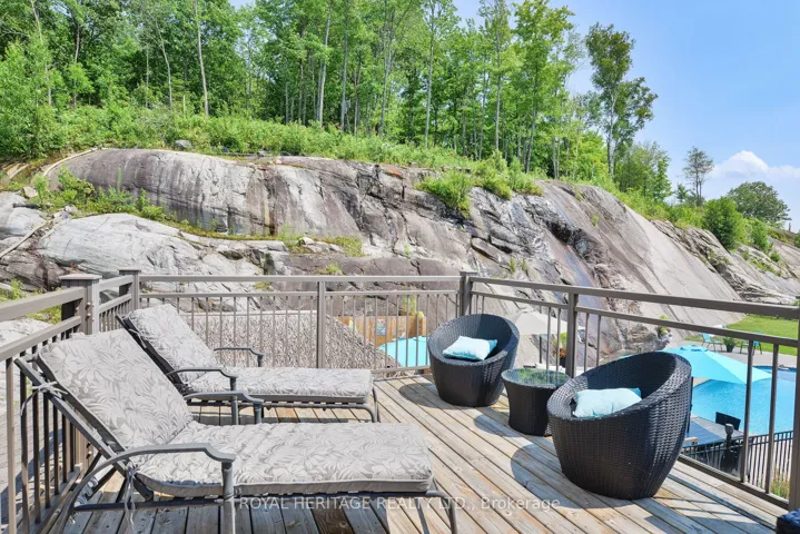 +"PublicRemarks": "Spectacular, unique, unforgettable. These are just a few words to describe this magical, one of a kind property. Formerly featured in a Muskoka magazine, the home and property offer plenty of space for entertaining, a growing family or simply reconnecting with nature and wildlife. Design elements, including local Muskoka granite picked and split by the owners hand and built into the feature wall and kitchen island, all help to create a space that welcomes you from its front gates to its front door and beyond. Soaring vaulted ceilings and architectural beams in the main living area and primary bedroom, as well as a thoughtfully redesigned interior created during the building of a significant addition completed in 2016, provided the owner and designer an opportunity to create a spacious, interesting yet functional space. Breathtaking views from numerous balconies, windows and patios overlook the grounds, gardens, 30ft waterfall and approx. 500 ft of Mother Natures perfect river front. The in-ground salt water pool, tiki bar, infrared sauna, built in hot tub, large gym, theatre room, ball court, sandy beach with gentle water entry for swimming, dock for boating, waters edge bunkie (sleeping 4 comfortably), the huge 5 car garage, large RV shed with oil pit and even the bonfire lookout on top of the hill of your 11 acre property will afford you the last ray of sunshine with the setting sun to complete your daily living experience. Should you ever wish to leave your property, you are just a few short minutes to the heart of Huntsville by car and a short boat ride along the river to Lake Vernon and further access to Fairy, Mary and Peninsula Lakes. Pictures may speak a thousand words but this property has thousands more to share with you in person. Private showings only."