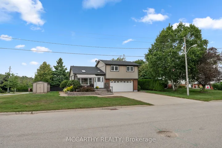 +"PublicRemarks": "Corner lot with large lot 80 x 100ft, 3 Bedroom 2 Bathroom well maintained 3 level Side split. Pretty entrance of paving stone walkway around the house and steps up to a welcoming deck, with pretty motorized awning. Come into the bright and airy 3 season sunroom. Large foyer with tile floor, double closet w modern sliding doors. Eat in Kitchen with plenty of cupboards with large window over double sink. Hardwood floors in dining room and Living room. Living room has pretty gas fireplace and large picture window over looking the large deck. Eat dinner in the large Dining room that is combined with the living room. Walk out from the dining room to the back deck and spacious back yard, great for family time or entertaining. wooden gazebo covers a Hot Tub. Double door gate to back yard. Spacious side yard with a large wood shed approx 10 x 16ft with hydro. Upper level has three good sized bedrooms and a spacious 4 piece Bathroom. Lower level Rec room has cozy feel with gas fireplace and is spacious and plenty of room for family time and entertaining. 2nd Bathroom has a large walk in tiled shower. The laundry room with plenty of cabinets for storage and folding. Utility room is combined with the laundry room. Need space for parking, this is it, 2 car garage plus concrete driveway with parking for 4 plus, total 6 parking spots, Great for the working couple, work vehicle, recreation vehicle, visitors or extended family cars. (No need to worry about winter parking spots. )Street is quiet as not a drive thru street, Corner lot is large and has good size on side and back yard. Very close to Elementary and Secondary schools, parks, recreation/arena. Perfect well maintained home for family living. Desired location, Move in ready. Book showing today, Must See."