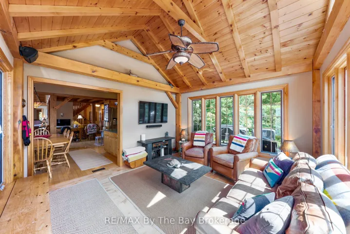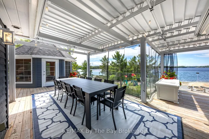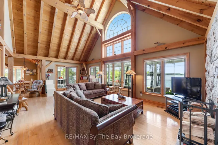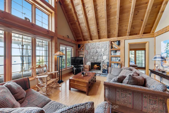 +"PublicRemarks": "This property is truly a private paradise on the clear waters of Georgian Bay, where 20 spectacular acres of trees, granite and over 1700 feet of waterfront await your arrival. This exceptional 2 1/2 storey, 5-bedroom, 4-bathroom post and beam cottage offers the perfect blend of rustic charm and modern comfort, creating an unforgettable lakeside sanctuary. Your adventure begins with a scenic 15-20 minute boat ride from Honey Harbour Marinas, delivering you to this secluded haven near the Musquash River Mouth. Enjoy the convenience of multiple docking systems and a floating double wet boathouse. The granite shore deck near the sandy beach area creates an elegant transition to the property. Landscaping combines crushed granite pathways with natural exposed rock formations creating stunning visual interest. Glass railings grace the expansive decks, providing unobstructed views and a louvered pergola system on the upper deck allows you to curate your outdoor experience. The main floor has a primary bedroom with ensuite, complemented by a convenient 2-piece bathroom and generous storage areas. The heart of the home features an open concept kitchen/dining area with spacious living room and a cozy wood-burning fireplace. A secondary sitting room provides additional gathering space for quiet moments. The walkout basement level transforms into an entertainer's dream with two additional bedrooms, bathroom facilities with separate shower, and a games room featuring its own wood-burning fireplace. The sunroom offers breathtaking water views and serves as the perfect morning coffee spot. A charming bunkie provides additional guest accommodation or serves as a peaceful retreat space. The western exposure ensures spectacular sunsets that paint the sky each evening, creating magical moments that will become treasured family memories. This remarkable waterfront estate offers the ultimate Georgian Bay experience, where natural beauty meets thoughtful design in perfect harmony."