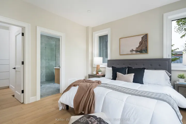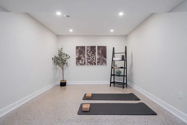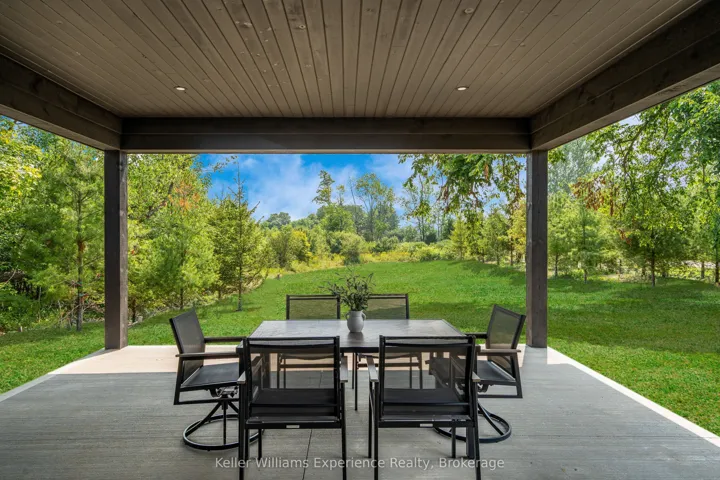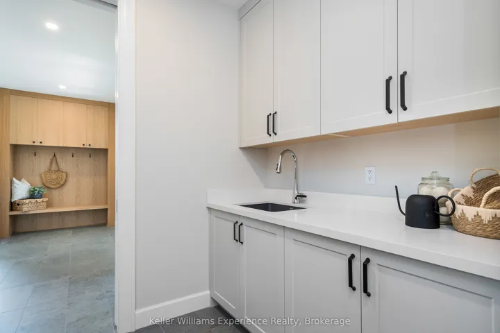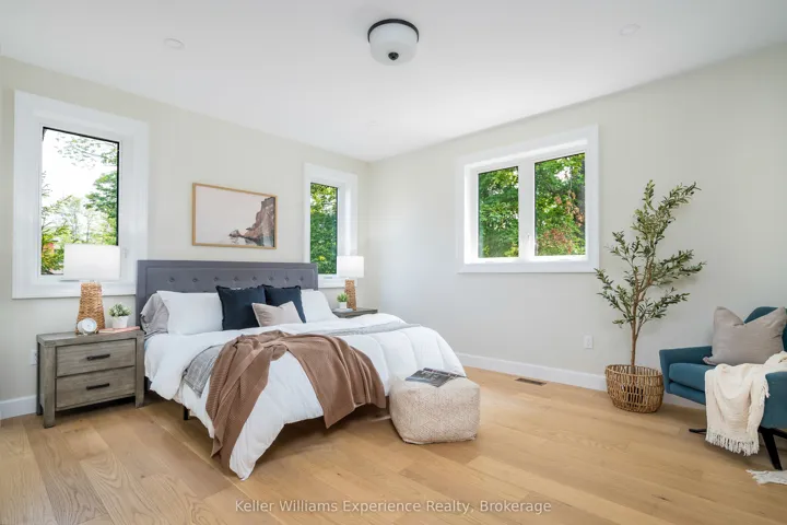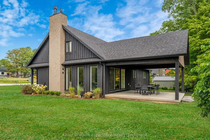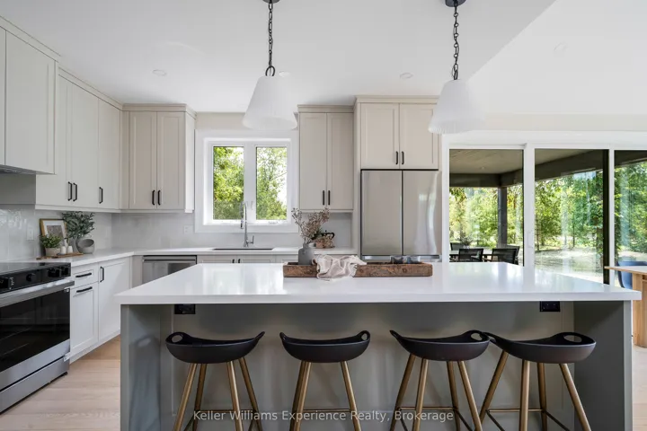 +"PublicRemarks": "This brand new construction, custom-designed residence is nestled in an exclusive enclave of just 12 private homes in the coveted Beaver Valley Woodlands. Crafted for those who value design, privacy, and seamless indoor-outdoor living, this 3,546 sq ft, 5-bedroom, 4-bath modern alpine retreat is set on 1.37 acres bordered by 100 newly planted spruce, pine, and fir. The striking exterior pairs onyx board-and-batten with cedar shake and natural hand-laid stonework for bold, elegant curb appeal. Inside, soaring 13-ft vaulted ceilings and floor-to-ceiling windows flood the great room with natural light, anchored by a dramatic fireplace clad in sophisticated porcelain stoneware. This true wood-burning hearth is the heart of the home, whether its a quiet night by the fire or an evening of entertaining. Every finish has been elevated, from the hardwood floors to the 8-ft solid poplar doors and trim. The kitchen is a showpiece: full-height custom wood cabinetry, an 8-ft quartz island in soft sage, artisan-glazed tile backsplash, and fully integrated stainless steel appliances. The main-floor primary suite offers a custom walk-in closet and a luxe ensuite finished in porcelain tile with a freestanding soaker tub, glass-enclosed rainfall shower, and warm wood vanity with quartz counters. Upstairs, two guest bedrooms--including one with its own fireplace--share a chic 3-piece bath. The lower level extends the homes sophisticated aesthetic, with a floating staircase accented in glass and steel leading to a bright rec room, full gym, two additional bedrooms, and a 4-piece bath. Heated exposed aggregate floors add polish and warmth throughout. The oversized garage is equally refined, with in-floor heating, waterproof wall finish, and epoxy floors, ideal for storing and maintaining everything from bikes to seasonal gear. Backed by the 7-year Tarion New Home Warranty, 104 Butternut Court is a refined retreat for those who live fully--in every season."