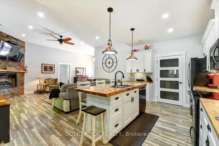 +"PublicRemarks": "Welcome to this stunning custom-built 4-bedroom, 2.5-bath home nestled on a private, professionally landscaped 1.9-acre lot. Perfectly situated just 5 minutes from all amenities and ideally located between Toronto and Ottawa with convenient access to both airports, this home offers a rare blend of privacy, space, and accessibility. Step inside to a spacious open-concept design featuring a large foyer leading to a living room with a cozy electric fireplace perfect for relaxing or entertaining. The kitchen is a true showstopper, boasting a unique live-edge center island ideal for casual dining and gatherings, complemented by a large walk-in pantry for ample storage and functionality. Radiant in-floor heating throughout including the oversized double-car garage ensures year-round comfort. The primary bedroom was thoughtfully designed to offer a peaceful sanctuary away from the main living area with a luxurious 5-piece ensuite bath and an extra-large walk-in closet. 3 additional bright and spacious bedrooms, a 4-piece bathroom which is conveniently located for family and guests. An additional family room with a 2-piece bath provides flexible space suitable for an extra bedroom, home office, or media room. A main-floor laundry adds to convenience and practical living. Step outside to experience exceptional outdoor living with a covered porch perfect for all seasons, plus two dedicated fire pit areas ideal for entertaining or quiet evenings under the stars. A grand circular driveway enhances curb appeal and provides ample parking. Two versatile outbuildings offer extra storage, workshop space, or room for recreational gear. The home also includes a Gener Link hook-up for backup power, giving you a peace of mind during outages. This exceptional property combines custom craftsmanship, modern amenities, and serene privacy on a beautiful lot. Easy to show, schedule your appointment today and dont miss this outstanding opportunity."
