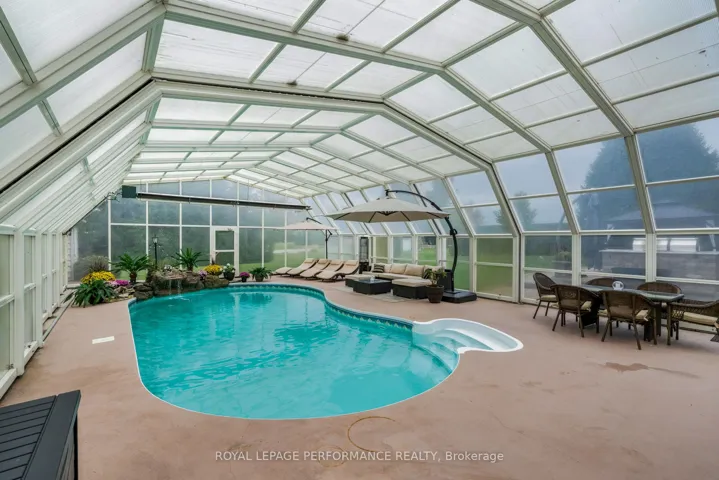 +"PublicRemarks": "Welcome to this extraordinary estate offering over 6 acres of private countryside living with luxury finishes, extensive outdoor amenities, and exceptional spaces for both entertaining and hobbyists alike. Step inside to find an elegant open-concept main floor featuring a chef-inspired kitchen with rich wood cabinetry, high-end appliances, granite countertops, and a striking stone backsplash. The expansive island with seating flows seamlessly into the bright dining area, highlighted by a crystal chandelier and large windows overlooking the scenic grounds. The inviting living room boasts custom built-ins and a cozy natural gas fireplace-perfect for family gatherings. The home offers 4 bedrooms filled with natural light, stylish bathrooms with modern vanities, and a lower-level retreat complete with heated floors for year-round comfort. Outdoors, enjoy resort-style living with an all-season in-ground pool under a retractable enclosure, multiple lounge areas, and a peaceful private pond. For the hobbyist or entrepreneur, this property includes a 2,800 sq. ft. heated garage plus an additional 1,600 sq. ft. garage-ideal for car enthusiasts, a workshop, or storing recreational toys. Located just minutes from town amenities yet surrounded by nature, this estate combines luxury, functionality, and tranquility. This is more than a home-its a lifestyle. Serious inquiries only and must be pre-approved before scheduling a visit."