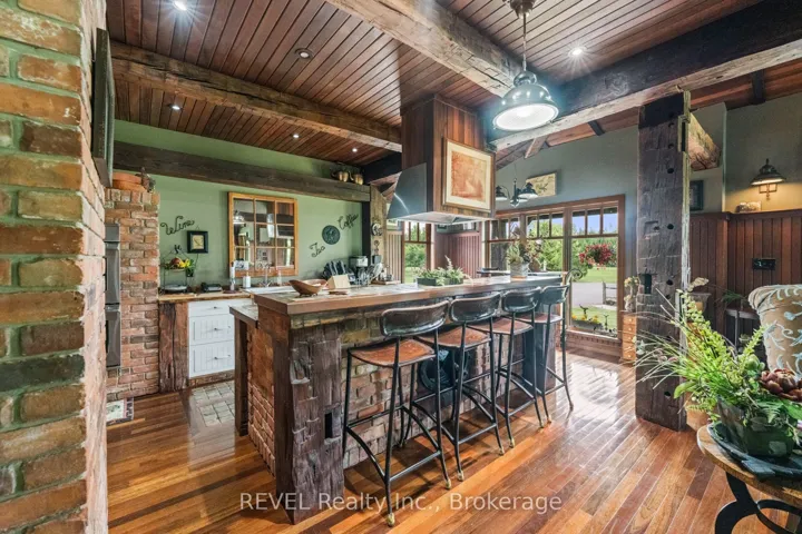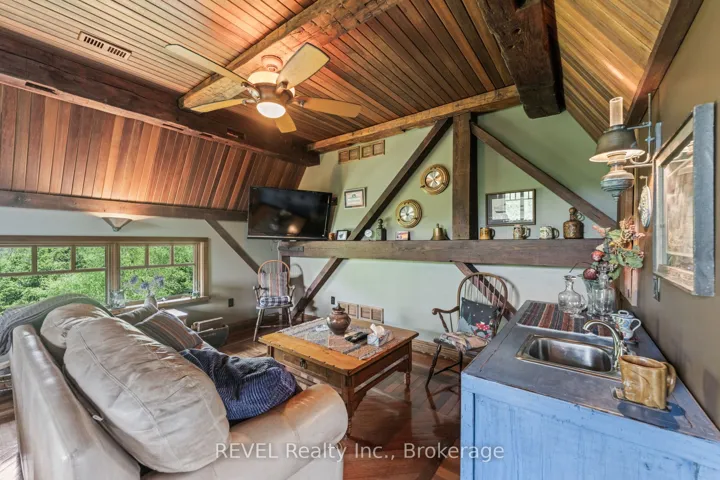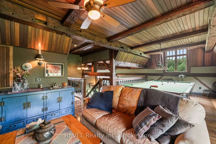+"PublicRemarks": "Welcome to 3111 Faywell Road situation in the quaint town of Fonthill. Once known as the 1896 "Old Seed Barn" this country barn style home has been reclaimed and rebuilt on this 17 acres parcel of land that boasts walking trails, a private waterfront pond, a long winding driveway and a golfing green. With nearly 1200 feet of Lake Gibson waterfront, enjoy your coffee with morning waterfront views on your wraparound covered porch and veranda. Make your way inside, the main features a stunning open concept dinning, living and kitchen area with nearly 17 foot ceilings. Custom wainscotting and panels cover every inch of this character home. With exposed beam construction you are able to take in the detailed craftsmanship of this build.Primary bedroom, ensuite and custom walk in closet conveniently located on the main level. Make your way up the staircase to the loft entertainment area with a wet bar. Additionally you will find another bedroom and full bathroom. The home features nearly 10,000 sq/ft; 2550 sq/ft of finished living space, 2400 sq/ft drive in basement, three car garage and additional 4661 sq/ft of constructed spaces. The lower level features a workshop, entertainment area and plenty of space for the car enthusiast. Not to mention the three car attached garage with a second storey waiting for your finishing touches."