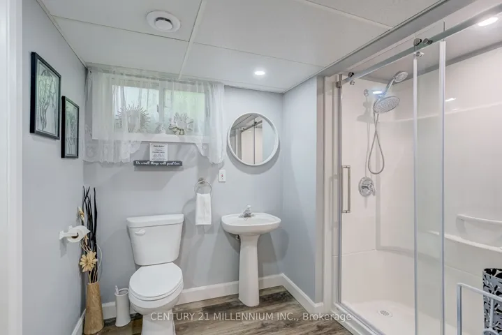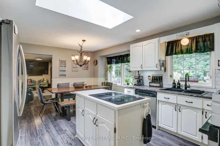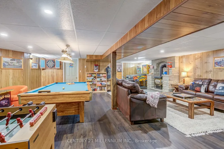+"PublicRemarks": "Experience the perfect blend of small-town charm and countryside tranquility with this exceptional property in a highly sought after area of Shelburne. Set on a beautifully landscaped .55-acre corner lot with mature trees, this home offers privacy, space, and a unique country in town feel just minutes from all amenities. A front yard sprinkler system keeps the lush landscaping vibrant and easy to maintain.A rare find, this property boasts two driveways, one ideal for trailers, RVs, or extra vehicles, plus a double car garage and parking for up to nine cars. Inside, you are welcomed by a tiled foyer with double closet leading to a formal living room with vinyl flooring and an oversized bay window. The cozy family room features a stone wood burning fireplace, wainscoting, and a walkout to the back deck. The kitchen is bright and inviting with a massive skylight, large windows, stainless steel fridge, and dishwasher.The spacious primary bedroom is a private retreat with a walkout to the deck and hot tub, a walk in closet, and a 5-piece semi ensuite. Two additional bedrooms each offer large windows and double closets. The main floor laundry room includes cabinets, a sink, and a side entrance with direct garage access, ideal for creating an in-law suite or basement apartment, plus a convenient 3-piece bathroom.The finished basement is an entertainers dream, styled with vintage wood paneling for a retro arcade vibe, complete with a bar, two bedrooms, a 3-piece bathroom, and a large utility room ready to be converted into a kitchen if desired.From summer evenings in your private backyard to hosting game nights downstairs, this property offers a lifestyle of space, flexibility, and fun in one of Shelburne's best locations."