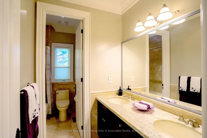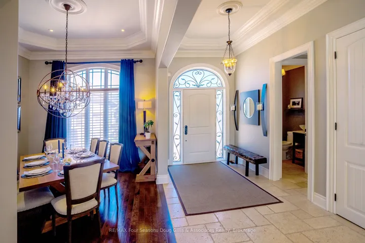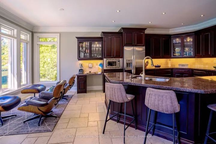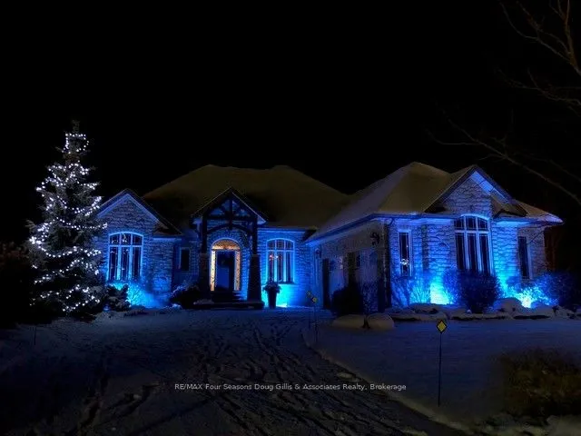 +"PublicRemarks": "Outstanding craftsmanship defines this full-stone bungalow, perfectly positioned beside green space and backing onto the 12th tee of the prestigious Lora Bay Golf Course. The home offers three bedrooms, four bathrooms, a private den, and a formal dining room. The main level features a spacious great room with vaulted and coffered ceilings and a gas fireplace, creating an inviting gathering space. A gourmet kitchen showcases granite countertops, solid maple cabinetry, stainless steel appliances, and a walk-out to the flamed-flagstone patio and pool area. The private primary suite includes a stone-faced double-sided fireplace, a four-piece ensuite with marble finishes, and tranquil backyard views, while two additional main-floor bedrooms provide flexibility for guests or family.The finished lower level features nine-foot ceilings, radiant in-floor heating, a large family room, a cold room or wine cellar, and exceptional storage space. Outdoors, the south-facing backyard is professionally landscaped and designed for entertaining, complete with a sixteen-by-thirty-two-foot inground pool with programmable LED lighting, flamed-flagstone surround, and ample space for lounging in full sun. An oversized twenty-one-by-thirty-four-foot garage with epoxy flooring accommodates vehicles, a golf cart, and workshop or storage needs. Additional details include an interlock stone driveway, under-eave exterior lighting, a tankless water heater replaced in 2022, a security surveillance system with hard-drive backup, fresh paint, and abundant natural light throughout. This impressive property combines timeless finishes with a coveted location, offering the Lora Bay lifestyle with golf, walking trails, and Georgian Bay just minutes away."