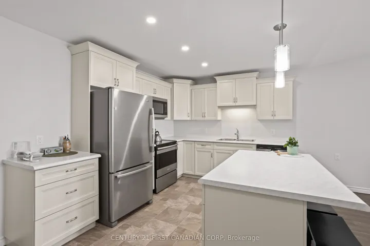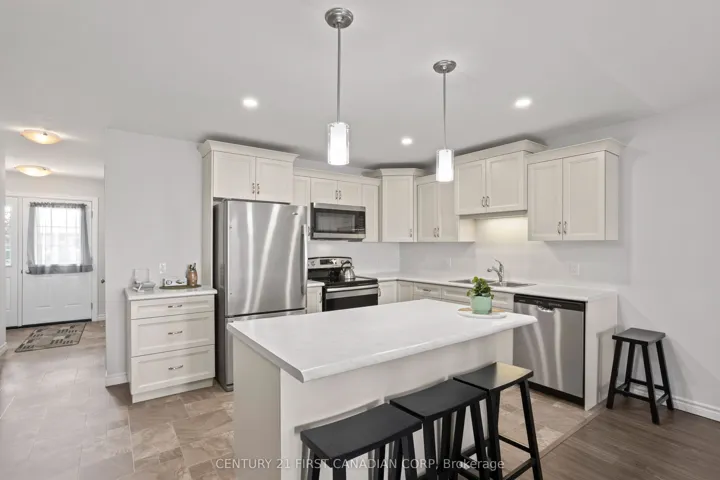 +"PublicRemarks": "Welcome home to Riverview Meadows, Exeters premier adult lifestyle community. Discover easy, elegant living in this better-than-new 2-bedroom, 2-bath bungalow located in the quaint town of Exeter, just 30 minutes to London and 20 minutes to the shores of Grand Bend. This impeccably maintained home offers true one-level living with thoughtful design and modern comfort throughout. From the moment you arrive, youll appreciate the covered front porch, deep concrete driveway, and attached garage with inside entry. Inside, vaulted ceilings and abundant natural light highlight the open and inviting layout. Premium laminate and vinyl tile flooring provide style and easy maintenance, while the open-concept design allows seamless flow between the kitchen, dining, and living areas. The kitchen features light matte grey cabinetry, stainless steel appliances, and a spacious island with seating. The dining area and cozy living room with a custom mantle and gas fireplace create an ideal space for entertaining or relaxing. From the living area, step out to the large concrete back patio with composite privacy fencing and gas BBQ hookup. Enjoy the walking trail to the serene community pond with koi fish and a lovely gazebo-perfect for quiet moments outdoors. The large primary suite features a 3-piece ensuite and two walk-in closets, while the second bedroom, 4-piece bath, and convenient laundry room provide everything needed for comfortable everyday living. Riverview Meadows offers amenities including a large multipurpose room with kitchen facilities, (a great opportunity to host your family get-togethers) manicured green spaces, landscaped common areas, seasonal walking paths, professional management. Experience low-maintenance living in a welcoming community designed for comfort, connection, and peace of mind, all just a short walk or drive to medical offices, grocery store & all Exeter has to offer! Where lifestyle meets ease."