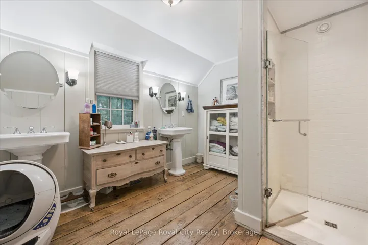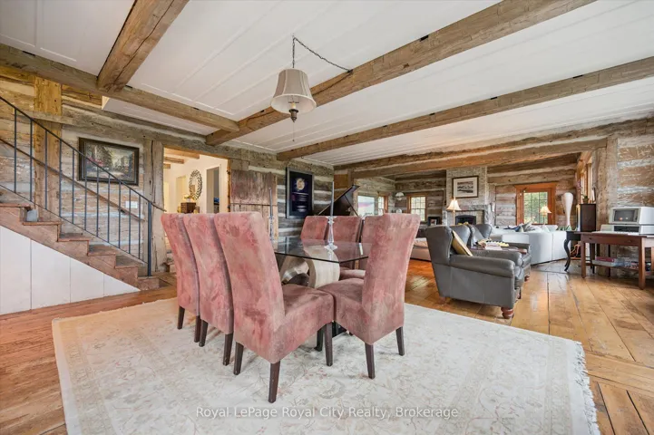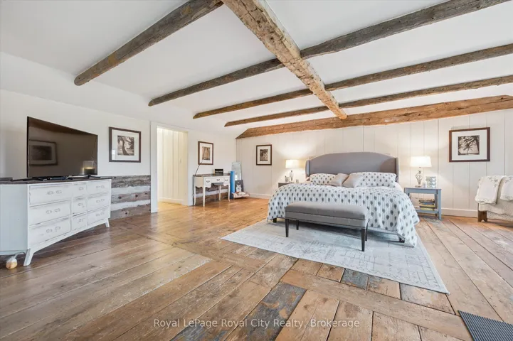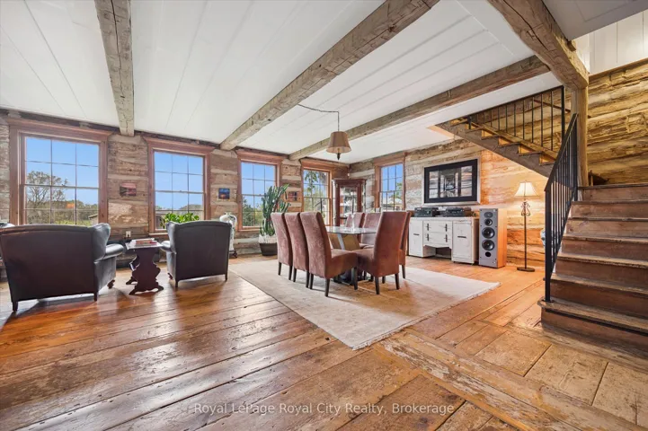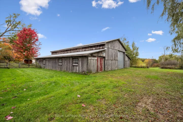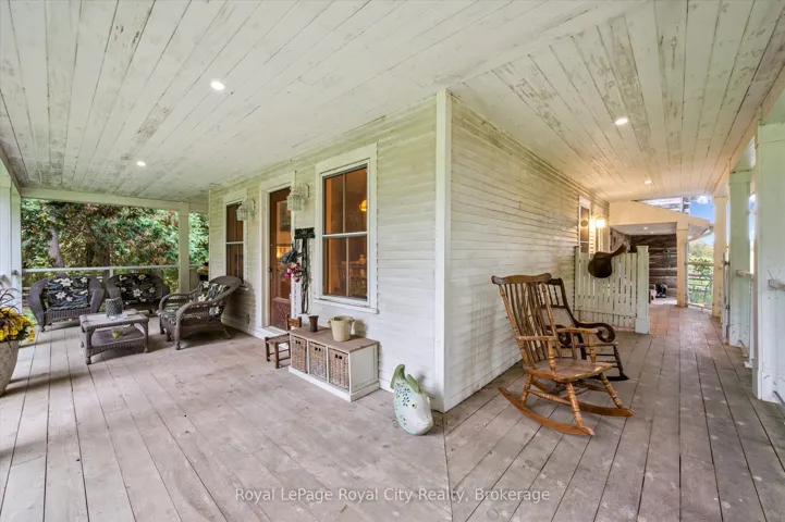 +"PublicRemarks": "A winding laneway tucked under a canopy of mature trees leads to this private 18-acre sanctuary, complete with a charming 2-BEDROOM GUEST HOUSE that mirrors the main farmhouse's rustic heritage. The welcoming wrap-around covered porch invites you to pause and take in the tapestry of natural features at your doorstep- sweeping countryside views, pastureland, and the gentle flow of the river, providing a serene backdrop in every season. Inside, the heart of the home lies within the combined family room and dining room, a spacious addition to the original 1880s farmhouse. Wide plank pine floors, handsome beams, and expansive windows frame panoramic views of the surrounding landscape, while vaulted ceilings soar above the family room, anchored by a rustic stone-and-brick fireplace, creating a warm gathering space that feels both historic and homey. The upper level hosts four inviting bedrooms, including a generous primary suite with a walk-in closet and a 4-piece ensuite, alongside a 3-piece main bathroom and the convenience of second-level laundry. A short distance from the main residence is a two-bedroom guest house with a rustic exterior that mirrors the farmhouse's heritage, and a tastefully updated interior with modern finishes, ductless heating and cooling (2023), and a chic wood stove. Equestrian enthusiasts will appreciate the two-stall barn with a new hydrant for year-round water, new fencing and gates on both the front and rear paddocks, and roughly 10 acres of hay fields, providing the perfect balance of pastoral beauty and functionality. Despite its rural setting, modern conveniences- including geothermal heating and cooling, high-speed internet, an on-demand Generac generator, EV charger, and a durable metal roof- combined with easy access to Arthur's amenities, schools, and services, ensure comfort without compromising the sense of seclusion."