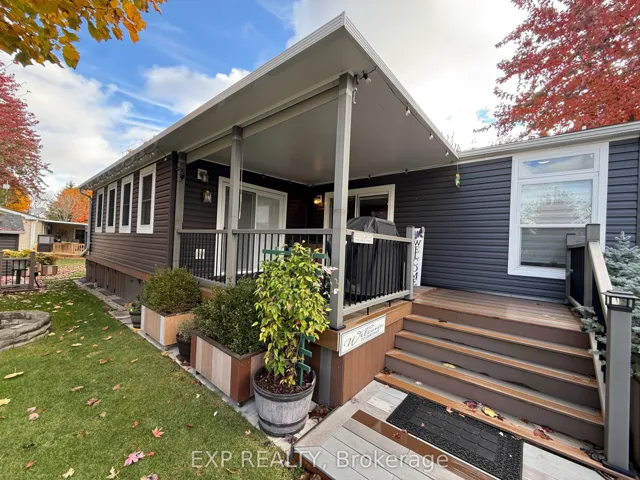 +"PublicRemarks": "Located in 9 month section of award winning Happy Hills Resort. Gorgeous Custom Built 2021 Commodore Park Model with Additional Sunroom (16 x 42 and 12 x 20). 8ft ceilings throughout allow for extra large double hung windows and transoms. Zebra blinds on all. Eye catching composite deck with hard top coverage. Sunroom also has composite flooring with loads of added storage, 3 ft windows and pendant lighting. Open concept kitchen has new fully upgraded stainless steel appliances including a higher end gas stove with air fryer and grill, fridge with ice cube maker, a dishwasher, microwave and farm house sink. Solid oak cupboards, and pull out drawer storage including unique pull out storage in "dead space corner". Cupboards are pulled over the fridge and gabled. 3 Stage Home Filter System and higher particle filter for kitchen sink and ice maker. Electric Fireplace in the living room. Both bathrooms have granite vanities and marble flooring. Built in dressers and extra storage in the master bedroom. The laundry is located in the closet in the second bedroom. Both bedrooms fit king size beds. Cement pad and insulated spray foam under both modular and sunroom. 7 x7 shed with hydro. BBQ included on front deck and there is another composite deck off the back door. Lovely castor planters with Blue Spruce in front. A truly beautiful location with a large heated family swimming pool, children's splash pad, heated adult's only swimming pool, a 9 hole golf course and driving range, Bocce Ball, Lighted Tennis court, Pickleball, Volleyball, Basketball, Shuffleboard, Horseshoe pits, Daily children's crafts/activities, hayrides, bingos, movies, special tournaments, mini animal farm, hiking trails, several playgrounds, lighted skateboard and bicycle activity center and more. Get in on this lovely lifestyle early! Contact listing agent for fees, deposit and occupancy requirements. 15 minutes to the 401and 10 minutes to amenities."