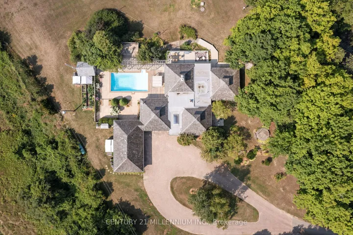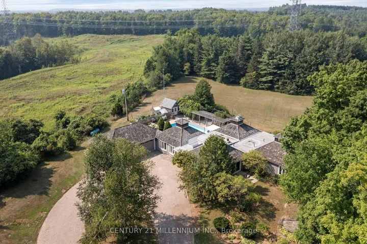 +"PublicRemarks": "Your wait for paradise is over! This 17-acre property features two paved driveway entrances, a beautiful spring fed pond, complete privacy and an exquisite 4-bedroom, 3-bathroom home. Drive up the tree lined driveway as the stress of your day escapes you and is replaced by peaceful easy feelings. This custom build has a smart layout with stunning views from every window, and the primary suite will make you never want to leave it! The lovely kitchen is this centre of the design opening to a breakfast nook, library, and dining room, plus the bedroom wing of the home. The great room is bright and airy walking out to the inground saltwater pool and sun filled patio. The walk out lower level is home to a huge rec room, a full bathroom with a sauna, laundry and so much storage. Efficient Geothermal heating with brand new 2025 furnace with transferable warranty, five fireplaces, seven walkouts, chicken coop, veggie gardens, a sugar shack plus a small barn and acres to wander and relax. Only 35 minutes to the GTA, 8 minutes to the village of Erin and 20 minutes to Guelph. Your rural oasis is waiting for you, do not miss it!"