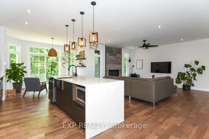 +"PublicRemarks": "Welcome to Your 2023 Custom Dual-living Design home built Ideally for in-law suite or rental income! This stunning home is thoughtfully designed for extended family living, featuring two full master bedroom ensuites, each with their own kitchen and living areas one on each level! Step into the inviting foyer adorned with rich maple hardwood floors, leading to a sleek, modern kitchen with custom cabinetry, waterfall quartz countertops, a pantry, and a large island with seating perfect for gathering leading to upper deck. The dining area boasts soaring 14' vaulted ceilings, while the spacious living room features an eye-catching gas fireplace for cozy evenings. The main floor master suite is a private retreat, complete with heated floors, double sinks, a standalone soaker tub, and a walk-in shower. Two additional bedrooms on this level are generously sized and separated by a full family bathroom. Downstairs, the bright walk-out level includes the second master suite with its own bathroom & walk-in closet, a quaint second kitchen, a dining and living area with a second gas fireplace, a den, and ample storage space. Enjoy outdoor living, relaxing and entertaining in the private backyard offering; a shaded patio, firepit area, and mature trees backing onto neighboring property with Cobb's lake creek. Additional highlights: High-speed Bell Fibe internet. Extra insulation for enhanced energy efficiency. Charming small town community with top rated elementary school & park area. A rare and versatile home perfect for multi-generational families or those seeking income potential with in-law capabilities. Don't miss your chance to view this one-of-a-kind property! 24-hour irrevocable on all offers."