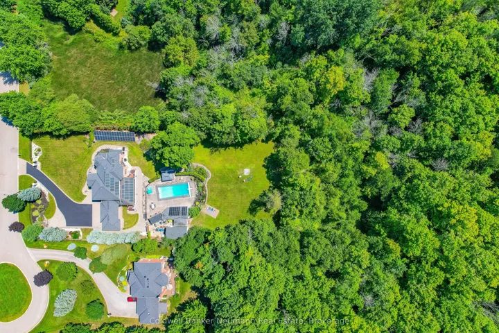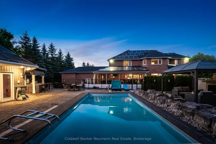 +"PublicRemarks": "Experience the perfect blend of luxury, comfort, and sustainability in this custom-built solid brick net-zero home, set on a beautifully landscaped 3-acre lot. A long private driveway welcomes you to the triple car garage and inviting wraparound covered porch.Inside, you'll find a bright, open-concept layout with soaring ceilings, 4 spacious bedrooms, and 4 bathrooms, designed for both family living and entertaining. Elegant updates include new upper-level flooring, baseboards, and wainscoting, lending timeless sophistication throughout. Two gas fireplaces create warmth and charm, while the fully finished basement offers exceptional space for a home theater, games room, rec room, and gym.Step outside to your private backyard oasis featuring a fiberglass in-ground pool with electric cover, surrounded by resort-style amenities. Enjoy a massive screened-in Trex deck, a natural gas BBQ area, outdoor bar, movie projector setup, and cabana with compost toilet and changing room-perfect for hosting memorable summer gatherings. A wood-burning fireplace doubles as a pool heater, extending your outdoor season and creating an unbeatable evening ambiance.Nature lovers will appreciate the meticulously landscaped grounds fed by a natural spring, with three water hydrants and irrigated garden beds-ideal for maintaining lush greenery or even crafting a winter skating rink.Peace of mind comes with extensive recent upgrades: triple-glazed windows (2022), new doors (2023), commercial-grade hot water heater (2023), and a high-efficiency furnace and heat pump (2024), delivering remarkable comfort with minimal operating costs.Nestled on a quiet, private court yet close to all amenities, this home truly offers the best of both worlds-a resort-like retreat with every modern convenience. A property that must be seen to be fully appreciated!"