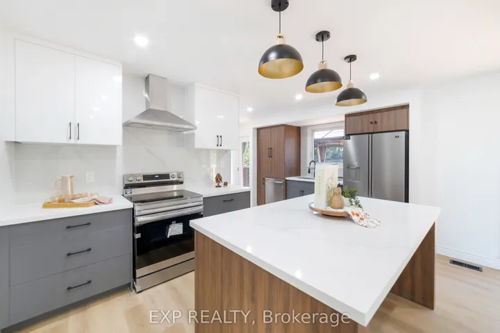 +"PublicRemarks": "Presenting a beautifully updated 3-bedroom, 2-bathroom bungalow, perfectly located in a highly desirable neighborhood on a sprawling 78ft x 150ft lot. Over $120,000 has been invested in upgrades, including a brand-new custom luxury kitchen valued at $40,000.Step inside to a spacious foyer that leads into a naturally lit living room, setting the tone for the elegance found throughout the home. The stunning kitchen features quartz countertops, timeless three-tone cabinetry, a modern black sink, and high-end stainless steel appliances. A central island offers the perfect space for cooking and casual dining.The main floor boasts three inviting bedrooms, including a master with a custom ensuite and built-in cabinetry. A bright, custom laundry room completes the main level. The lower level offers a partially finished space with a beautiful rec room, providing versatile options for family living or entertainment.The fully fenced backyard is an entertainer's dream, featuring a large above-ground pool, a substantial deck, and an expansive covered porch ideal for year-round relaxation. Additional highlights include an attached garage, asphalt double-wide driveway, and meticulously maintained landscaping with a brick front and walkway enhancing the home's curb appeal.Other notable upgrades include attic insulation (2025), appliances (2025), kitchen cabinets (2025), renovated bathrooms (2025), brand-new pot-lights (2025), and much more. This home is truly move-in ready and offers a perfect blend of luxury, comfort, and functionality."