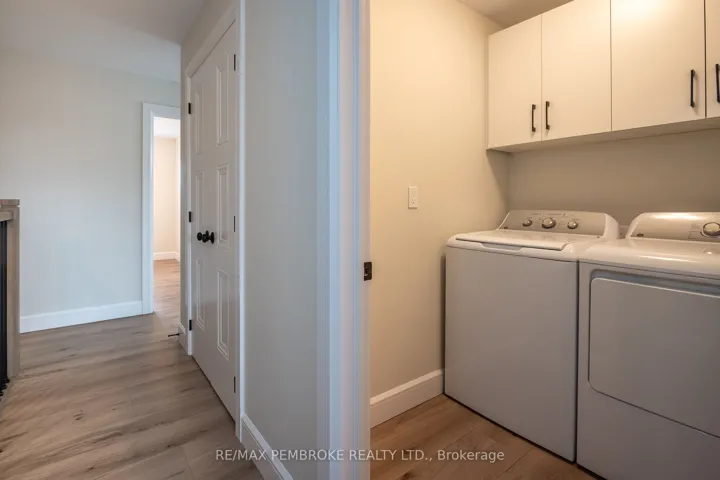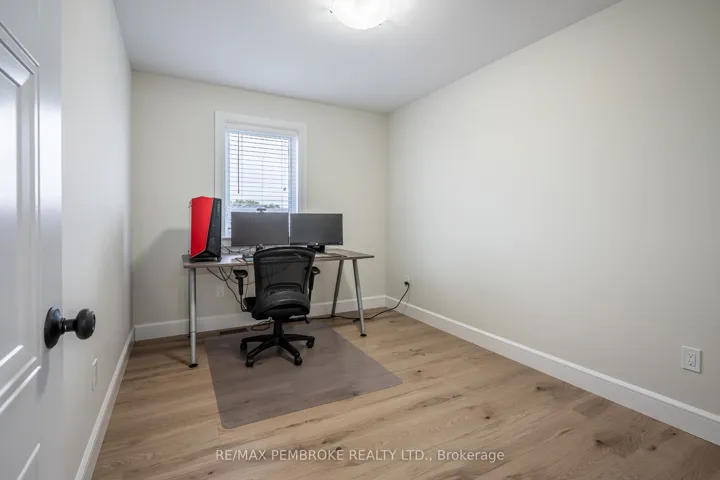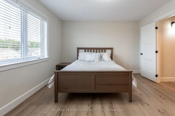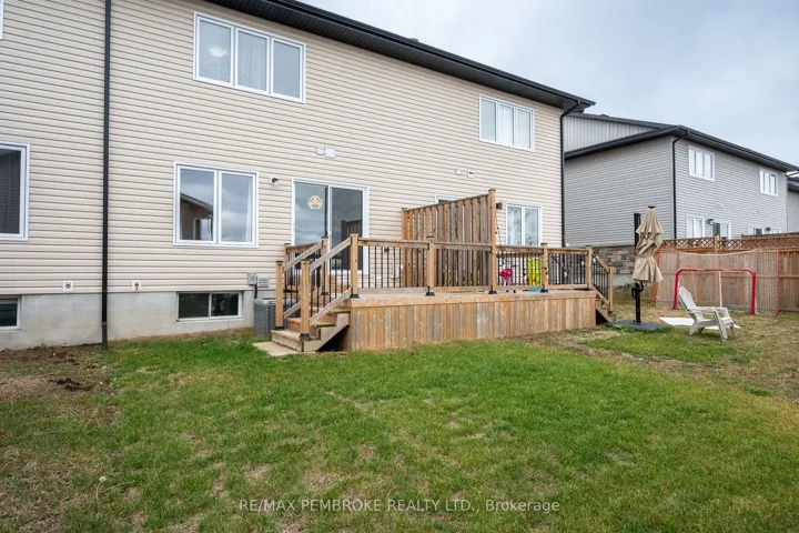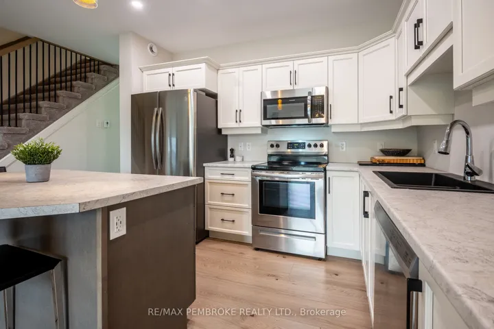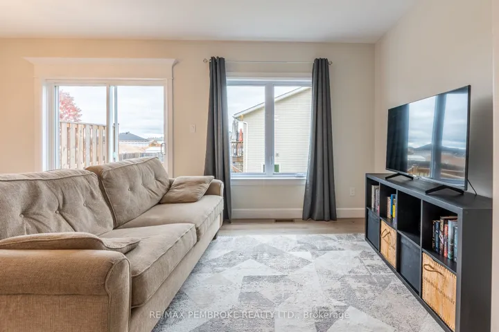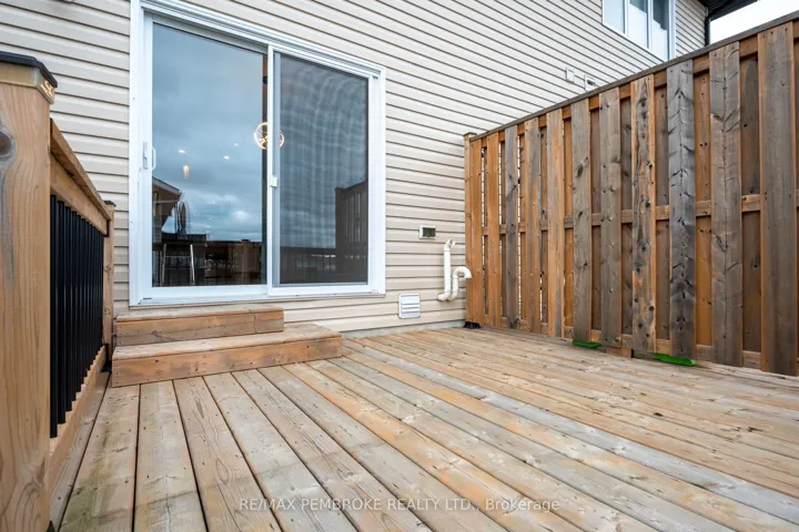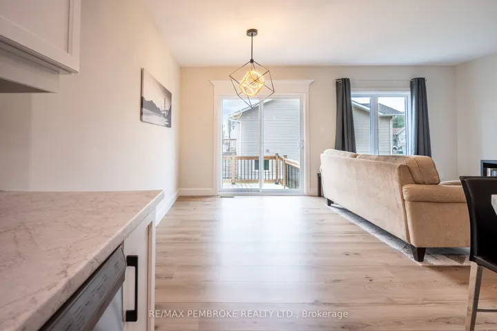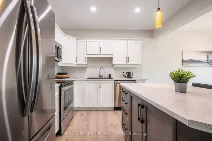 +"PublicRemarks": "This modern, beautifully maintained three bedroom, three bathroom townhouse is ideal for someone looking for quality finishes and style throughout. This bright and airy home is move-in ready whether to owner-occupy or as an investment property. The main floor features an open concept living-dining-kitchen layout with 8.5' ceilings and large windows offering ample natural light and patio doors that lead to a deck perfect for outdoor lounging. The generous kitchen is finished with plenty of custom cabinetry cupboards, a large island, and stainless steel appliances. The main floor is completed with a convenient powder room and foyer with large closet. Luxury vinyl plank flooring throughout the main level is continued again on the second floor, and all bathroom floors are finished with ceramic tile. The large primary suite includes an impressive walk-in closet and full ensuite with walk-in shower. Two additional bedrooms share a full bathroom, perfect for family or guests. The upper floor is complete with a handy laundry room and large linen closet. The lower level has a spacious family room as well as a large enclosed storage area. This home offers the added convenience of an attached garage with an automatic opener. This lovely townhome is close to Garrison Petawawa and a short commute to Highway 17 and CNL. Minimum 24-hour Irrevocable on any written Offer from a Buyer."