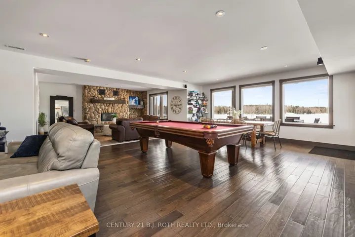 +"PublicRemarks": "Experience ultimate privacy and breathtaking lake views from this exceptional waterfront estate, featuring 521 feet of pristine shoreline and west-facing exposure for year-round sunsets over a quiet, serene bay. Perfectly tucked away from boat traffic and road noise, yet ideally located for endless adventures on Lake Manitouwabing.This luxurious retreat offers 3+2 spacious bedrooms, including a stunning 27' x 15' waterfront King Suite, and three elegant bathrooms with spa-inspired features such as a double shower and soaking tub. The open-concept living space combines comfort and style with vaulted wood ceilings, hand-scraped floors, and striking floor-to-ceiling stone fireplaces.A chef's kitchen with high-end stainless steel appliances makes entertaining effortless. Step outside to a waterfront granite patio, fire pit, and deep-water dock-ideal for swimming, boating, and soaking in the natural beauty. Relax in the hot tub or make use of the massive 2,000 sq. ft. detached garage/workshop for all your recreational and storage needs.A rare offering, this property delivers the perfect balance of luxury, tranquility, and adventure on one of the area's most coveted lakes."