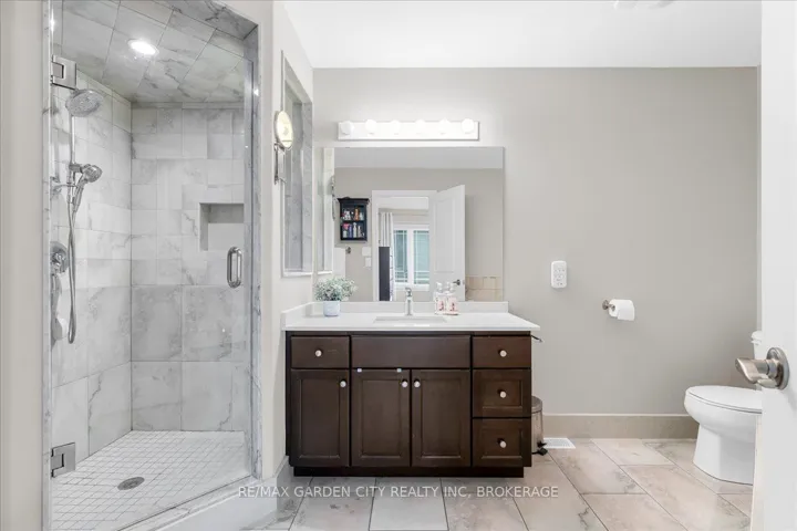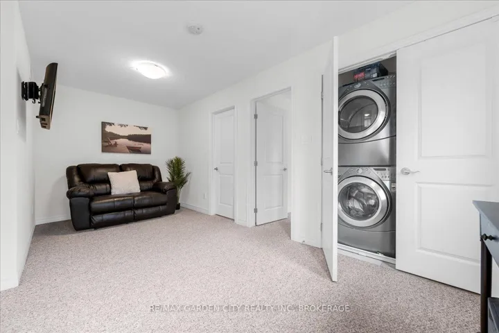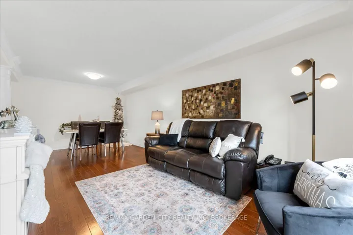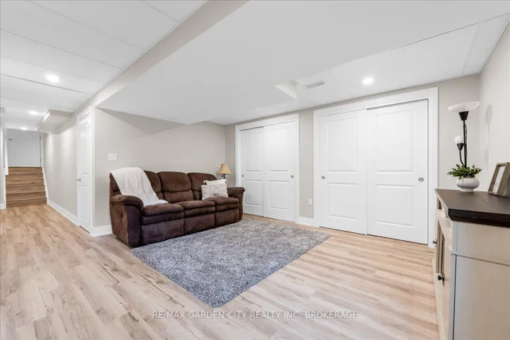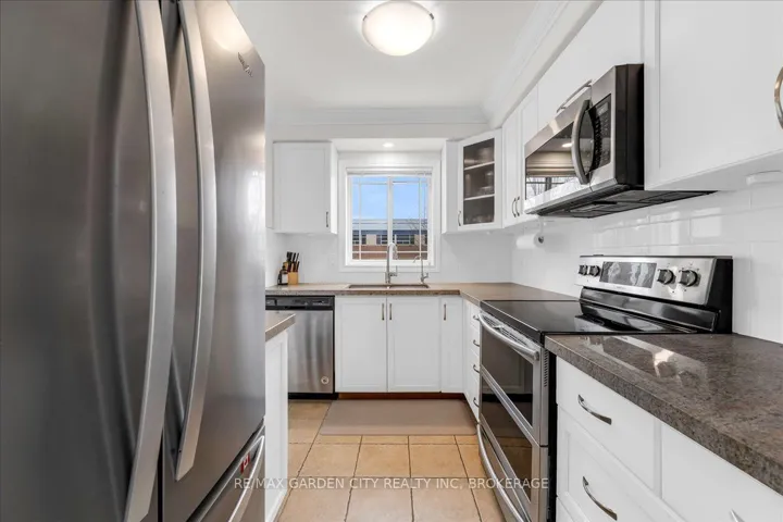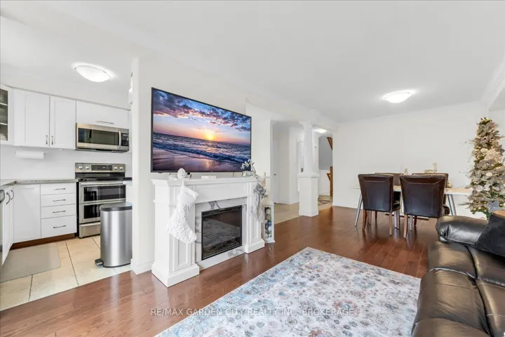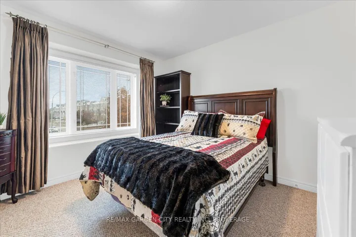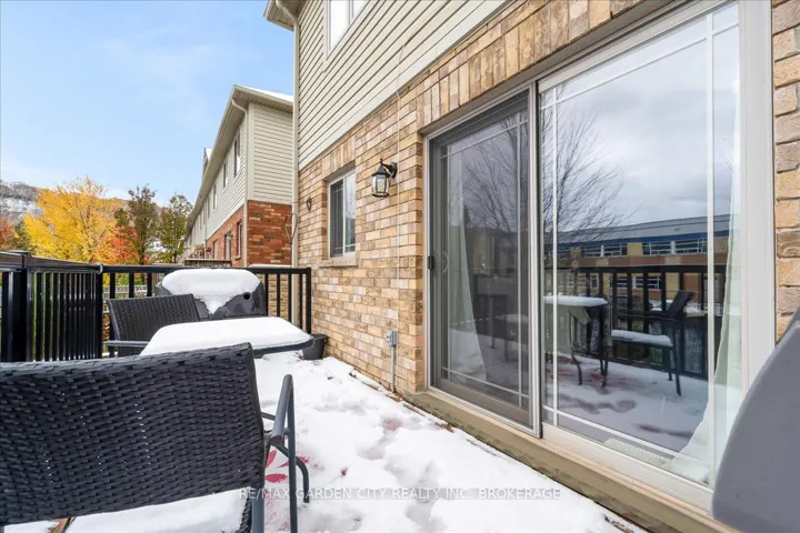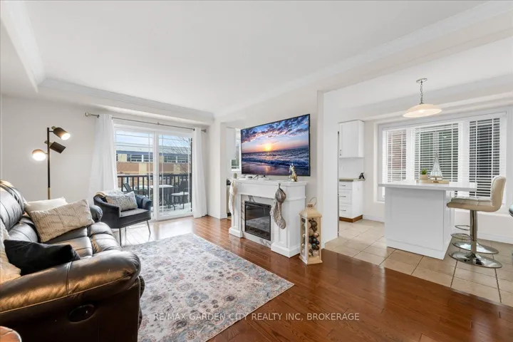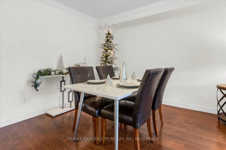 +"PublicRemarks": "This charming end-unit freehold townhome is nestled in a warm, family-friendly neighbourhood with scenic views of the Niagara Escarpment. A private side entrance opens into a beautifully maintained and stylishly decorated space. The formal dining and great rooms feature hardwood floors, crown moulding, and sliding doors leading to a deck overlooking the backyard. The bright eat-in kitchen offers plenty of cabinets, quartz countertops, a built-in microwave, and a large side window that fills the main floor with natural light. Just a few steps down is a 2-piece bathroom with an updated vanity. On the way to the second level, a spacious landing can serve as an office or cozy sitting area. The upper level boasts a huge loft with double doors to the laundry area. The large primary bedroom is bathed in light from oversized windows and includes a walk-in closet and ensuite with a corner soaker tub and separate shower stall. A good-sized second bedroom also enjoys a large window. The recently finished basement features a family room with an oversized window, double closet storage, and rough-in for a wet bar or second kitchen, as well as a 3-piece bathroom and utility room with extra storage. Outside, an expanded composite deck leads down to a large concrete patio and maintenance-free backyard, perfect for entertaining or relaxing. A covered patio section is ideal for hot or rainy days, and a shed provides extra outdoor storage. Concrete stairs lead up to the main entry, and the single-car garage offers convenient inside access to the foyer. The shingles were replaced in 2025. This delightful neighbourhood is close to parks, a community centre, QEW and GO access, schools, Lake Ontario, shopping, golf, wineries, and more. Comfort, convenience, and beauty make this the perfect place for your next move."