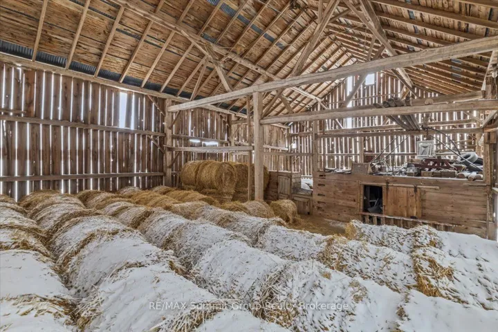+"PublicRemarks": "Just over 100 acres, located only 15 minutes from Collingwood, offering approximately 60 to 65 workable acres, 5 acres of pasture, and 25 acres of hardwood bush, with the balance made up of the home and outbuildings. The workable land is a combination of Listowel Silt Loam and Osprey Loam soils, both known for good drainage, strong nutrient-holding capacity, and suitability for crops. The house is a solid red brick two-storey built around 1900 with about 1,600 sq ft of living space and features five bedrooms, a 3-piece main floor bathroom, and a 3-piece ensuite on the second floor, along with original hardwood floors, older windows, a metal roof, a covered front porch, and a back mudroom. The stone foundation with poured foundation addition is in good condition and the basement includes the laundry area, a cold room, and the forced air oil furnace with convenient exterior access. Outbuildings include a 20' x 20' garage with a concrete floor, a 30' x 60' drive shed with two large doors and a dirt floor, and a traditional bank barn with water. This is an excellent farm with a practical and workable setup, quality loam soils, useful buildings, and a farmhouse ready for its next chapter."