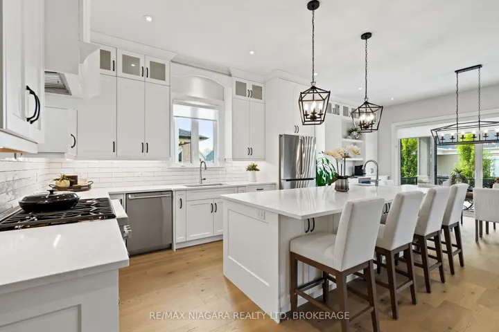 +"PublicRemarks": "Discover low-maintenance luxury living in this beautifully designed bungalow, perfectly situated between Niagara-on-the-Lake's vineyards and the amenities of Niagara Falls. This home offers the ideal blend of style, function, and comfort for today's modern buyer. Step inside to soaring ceilings, elegant panel detailing. The chef-inspired kitchen features quartz countertops, custom built-in cabinetry, and a premium Thermador gas stove, perfect for entertaining. With 5 spacious bedrooms, a bonus room ideal for a home gym or office, and two full kitchens (including one in the finished basement), the layout is ideal for multi-generational living or hosting guests. Relax by one of two gas fireplaces or enjoy the outdoors on the covered patio. Notable Features: Engineered hardwood flooring throughout, Heated floors in all bathrooms, Motorized electric blinds, Second kitchen in basement, AC (2022), HVAC (2022), Roof (2022) In-ground sprinkler system, Double garage + driveway parking"