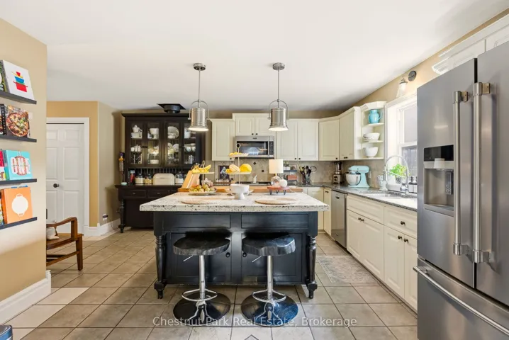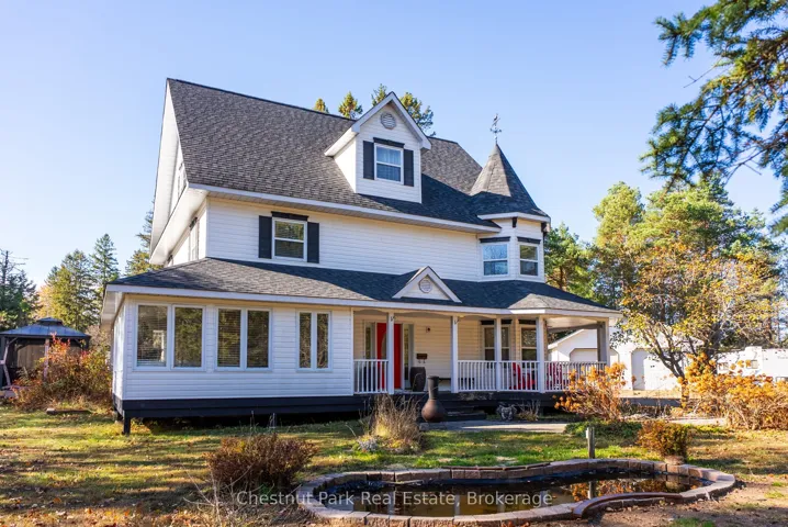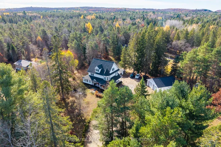 +"PublicRemarks": "Privately enveloped by mature trees, this spacious and inviting home sits on a beautiful 1.33-acre level lot just minutes outside of Huntsville. Offering over 4,200 sq. ft. of finished living space, this property is designed for comfort, flexibility, and everyday living - ideal for growing families, entertaining, or creating dedicated hobby and work areas. The main level features a warm, functional kitchen with custom cabinetry, granite countertops, a pantry, and a matching hutch with seating that can remain. The adjoining living area offers a cozy electric fireplace, while the bright sunroom is the perfect place to enjoy morning coffee overlooking the backyard. A convenient 2-piece bath completes this level. Upstairs, the primary suite offers a generous sitting area, walk-in closet, and a private ensuite with jetted tub and separate shower. An additional bedroom and a well-designed laundry space with custom cabinetry complete the second floor. The finished third level provides flexible space for a bedroom, studio, playroom, or home office.The lower level features a large, naturally lit recreation room with custom cabinetry, a hobby/storage room, and plenty of space for future personalization. Outside, enjoy evenings under string lights, gather around the fire pit, or cool off in the above-ground pool (approx. 3 years old, sand pump included). The yard is beautifully landscaped with mature evergreens, apple and pear trees, productive grape vines, and a blueberry bush. A wrap-around, fully lit porch and perennial-lined walkways add charm and character. Additional updates include shingles and eavestroughs (2023), owned hot water tank, oil-forced air heating with humidifier, garbage disposal, sunroom window coverings, and outdoor dining table with benches. A peaceful setting with easy access to Huntsville amenities, this home offers space, comfort, and a beautiful natural backdrop."