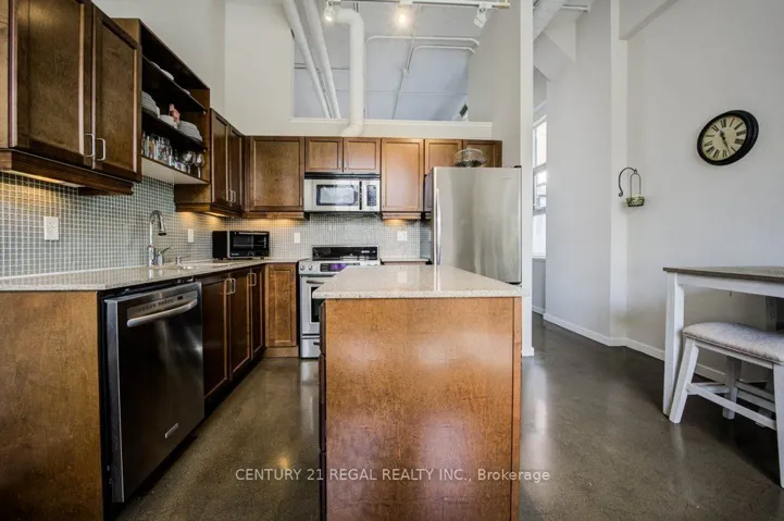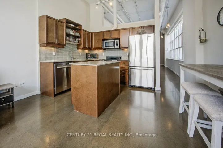 +"PublicRemarks": "Welcome to Kaufman Lofts! This stunning corner unit delivers true loft living with 2 bedrooms, polished concrete floors, soaring 13-ft ceilings, massive windows, and authentic industrial vibes throughout. Wrap-around windows and a Juliette balcony flood the space with natural light, while electronic privacy blinds on every window (over $10K value) add instant convenience. The open-concept living and dining space is perfect for entertaining, and the modern kitchen checks every box with shaker-style wood cabinets, quartz countertops, a glass backsplash, stainless steel appliances, double undermount sink, and a centre island with plenty of storage. Both bedrooms are generously sized, with the primary bedroom featuring brand-new sliding barn doors that add style and function. You'll also find a 4-piece bathroom, ensuite laundry, plus 1 parking spot and 1 locker. Set in the iconic former Kaufman Footwear Factory, this authentic loft sits right in the heart of Kitchener's Innovation District - steps to Google HQ, Mc Master Campus, Conestoga College, UW School of Pharmacy, GO & VIA Transit, the LRT, and some of the city's best restaurants, cafés, shops, and nightlife. Priced to sell and offering incredible value - this is your chance to snag a true loft at an amazing price. Great unit! Great building! Unreal location! Don't miss it! **Extras: Rooftop terrace with BBQs, party room, bike storage. Maintenance fees include high-speed internet, heat, A/C, water, and parking."
