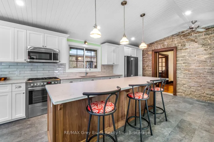 +"PublicRemarks": "This 1929 stone house is one of Owen Sound's true gems. Meticulously cared for, it offers peace of mind with turn key readiness for the next owner. After thoughtful renovations, this home harmoniously blends timeless charm with modern comforts. Featuring 4 bedrooms and 2 full bathrooms, original hardwood floors, exposed stone, preserved trim and doors, this home beautifully celebrates its heritage while embracing luxury living. The brand-new kitchen, completed in 2025, is an entertainer's dream. Other recent upgrades include gas boiler, hydro stack, all new windows, in-flooring heating in kitchen and both bathrooms, concrete driveway, basement waterproofing, sump pump, garage, roof shingles, sewage pipe, eaves troughs, soffit, fascia, downspouts, hot water tank, washer and drier, heat pumps in main bedroom and kitchen. Step outside to a fully landscaped rear yard and large stone patio to experience the comfort and beauty of this downtown treasure. Schedule a private tour today and make this stunning home your own."