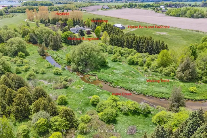 +"PublicRemarks": "Looking for lifestyle change? Enjoy serene country living just minutes from golf course, Belwood Lake and the thriving town of Fergus. This unreal property is ready for new owners to make lasting memories. Zoning here allows for the building of a 2nd single-detached dwelling. Nestled on 54 acres you will find this 2200 sqft walkout bungalow positioned well off the paved road in this ultimate of private settings. Ever thought of organic farming? This land has not had herbicide or pesticide used for over 30 years. A house that checks all the boxes... ranch style bungalow with oversized attached 2 car garage, finished walkout basement with recroom, sauna, office, storage and workshop, 4 bath, 4 bedroom, floor to ceiling brick fireplace, soaring cathedral ceiling, sunken Living and Family room, main floor laundry, 3 season sunroom, family sized kitchen with island, pantry and walkout to deck. Outdoor adventure awaits while you navigate your very own trails along the Irvine Creek, forests and pond. Dreamed of having horses/livestock? You'll find a manageable 8 stall barn (33'x48') with wash stall, tack room, and an attached hay storage barn (40'x32'). 5 Acres (tile drained) fenced paddocks, 14 acre (tile drained)hayfield, additional 7 acres that could be worked. (Total of potential 27 acres workable). Double sized workshop/storage 24'x 50'. Propane furnace October 2021, roof shingles 2010. Be sure to watch the virtual tour for additional photos and iguide tour for floorplan and layout. Property is currently fully taxed at Residential rate, taxes will be significantly lower once agricultural rate is applied. Please take the time to walk the trails along the river to truly appreciate the peace and quiet this property offers."