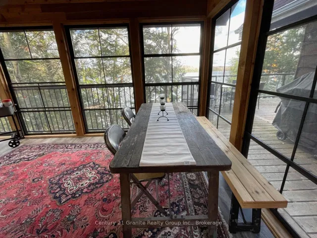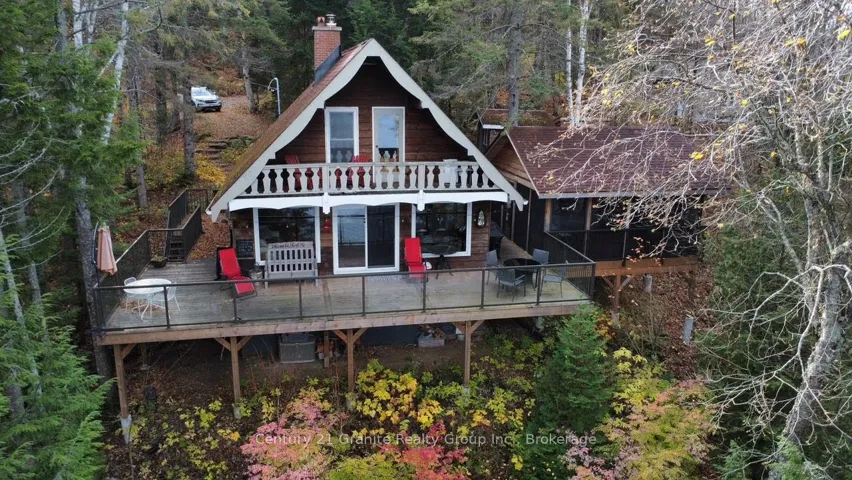 +"PublicRemarks": "Welcome to this lovely 4-season chalet on spectacular Miskwabi Lake! Large lot with 190 feet of waterfront with clean rock and sand shoreline, and incredible big-lake view. Almost an acre of land, well-treed for great privacy. Nice level area at the waterfront and deep water off the dock - perfect for swimming and boating. Enjoy summer sunsets from the dock. Open-concept main floor features custom kitchen with granite countertops and island, and picture windows framing the awesome lake views. Walkout to large wraparound deck - and new 18' x 18' 3-season screened porch/sunroom with retractable window system - outdoor entertaining at its finest! Main floor has one bedroom and 4-piece bath. Upstairs there are two more bedrooms, including main bedroom facing the lake with its own private balcony. Downstairs there is a cozy rec room with walk out, wood stove, and lower floor laundry. Heated water line with UV system. Plus there's a newer 32' x 16' garage, with separate storage room - great for office space, games room or workshop. Easy access by year-round Municipal road - Broken Paddle is a quiet dead-end road with only 10 cottages. Just 20 minutes to Haliburton village for shopping and services. Miskwabi Lake is part of a 2-lake chain with Long Lake - located at the top of the watershed for exceptional water quality. Enjoy miles of boating, water sports and lake trout fishing on this desirable lake system."