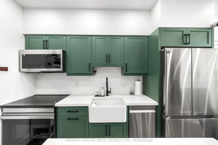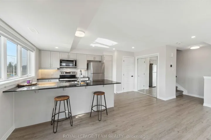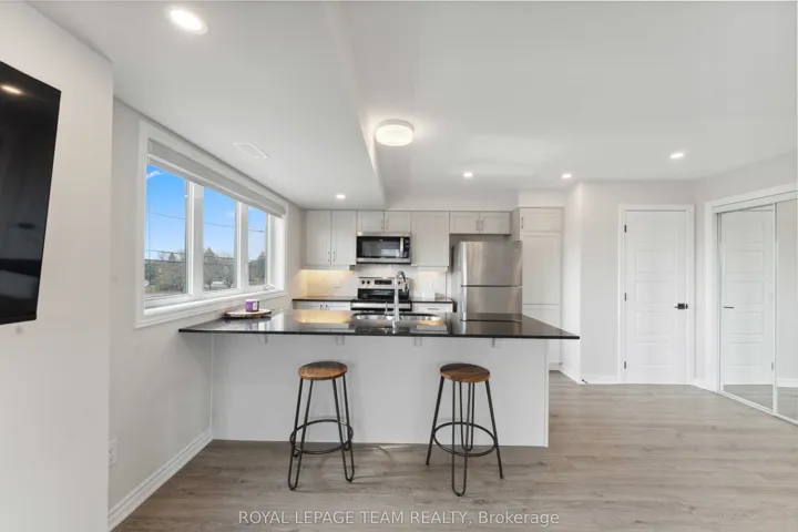 +"PublicRemarks": "Modern end-unit stacked townhome backing onto open fields and offering TWO dedicated parking spaces. The main level is filled with natural light and features a bright open-concept layout with contemporary hardwood flooring. The upgraded kitchen features stainless steel appliances, granite countertops, an upgraded backsplash, additional cabinetry, and a breakfast bar. A convenient powder room is also located on the main level. Enjoy a private patio area for outdoor living.The upper level includes a spacious primary bedroom with its own balcony, two additional well-sized bedrooms, and a full bathroom. Ideally located within walking distance to schools, shopping, and public transit, with nearby walking and biking trails in a private community setting. Immediate occupancy available. Tenant responsible for heat, hydro, water, and hot water tank rental."