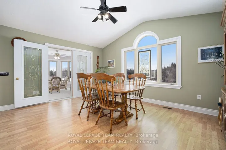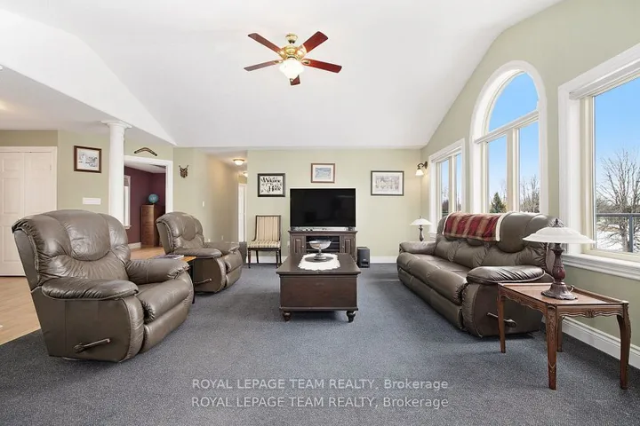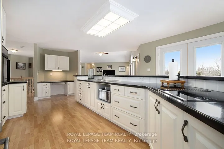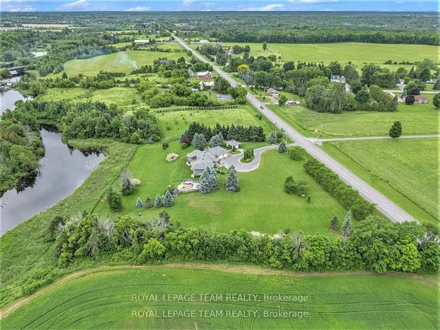 +"PublicRemarks": "Executive Custom-Built Home Located on the South Branch of the Rideau River, this exceptional home offers approx 4800 square feet of space on a stunning 7+ acre waterfront property. Great opportunity for Multi Generational family living. Designed to capture breathtaking south-facing views, this home is perfectly positioned to enjoy spectacular morning sunrises and nature viewing from nearly every room. The main level boasts 2,400 square feet of open-concept living with vaulted ceilings in the great room and spacious eat-in kitchen and dining area and access to a four season sunroom. The kitchen features granite counter tops, cooktop and built in oven with generous cupboard space, including access to a butlers pantry .The main area also boasts a large primary suite with a walk-in closet and a 5 piece ensuite with a built-in vanity, . Additional rooms on the main level include 2 additional bedrooms , laundry room, mudroom and a 2 piece bathroom. A grand curved staircase leads to approx 1500 square feet of finished living space which includes a large rec room with a kitchenette/bar area, 2 well sized bedrooms, and a 5 piece bathroom which makes this area a self contained living space for relaxation or entertaining. Additional mechanical and Storage room .A highly efficient ground-source geothermal heating and cooling system combined with lower level in-floor radiant heating ensures energy efficient comfort all year round. The attached oversized two-car garage is insulated and provides inside access to both upper and lower levels, while a detached single car garage offers additional storage and workshop space. Outdoor living is just as impressive with a generous upper deck and a lower patio area overlooking the South Branch of the Rideau River. This rare executive home seamlessly combines energy efficiency and natural beauty, making it a truly exceptional find. To fully appreciate the property make sure to view the attached videos"