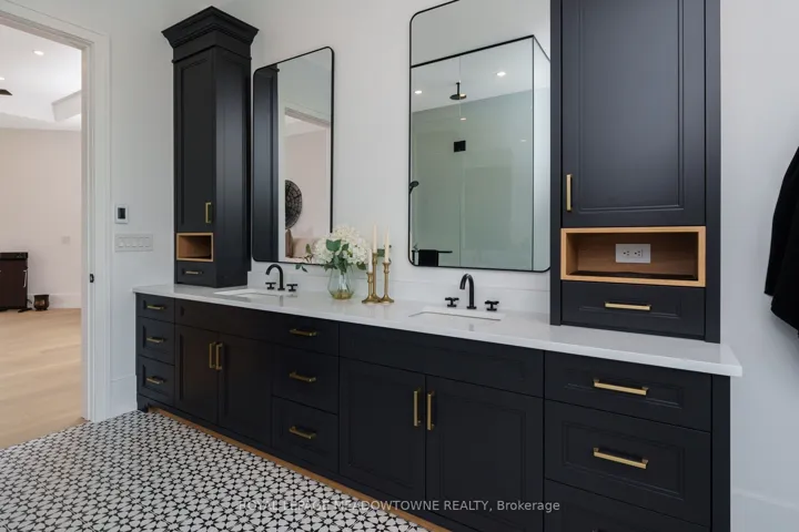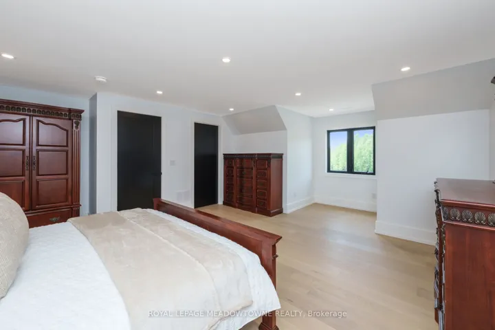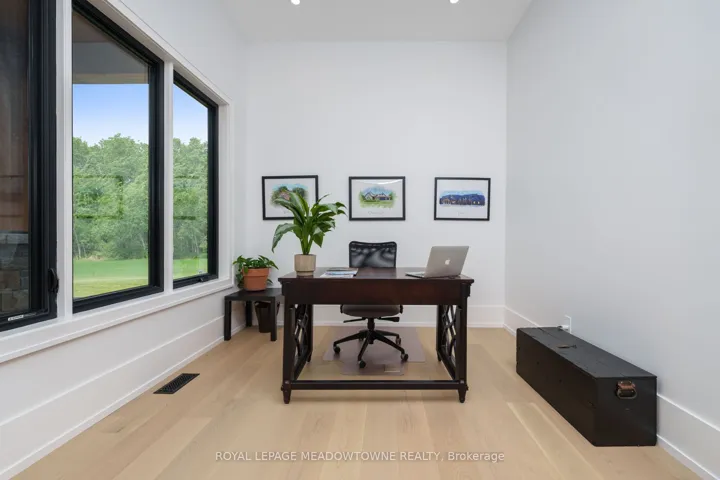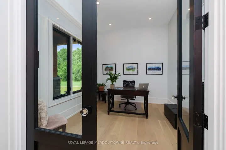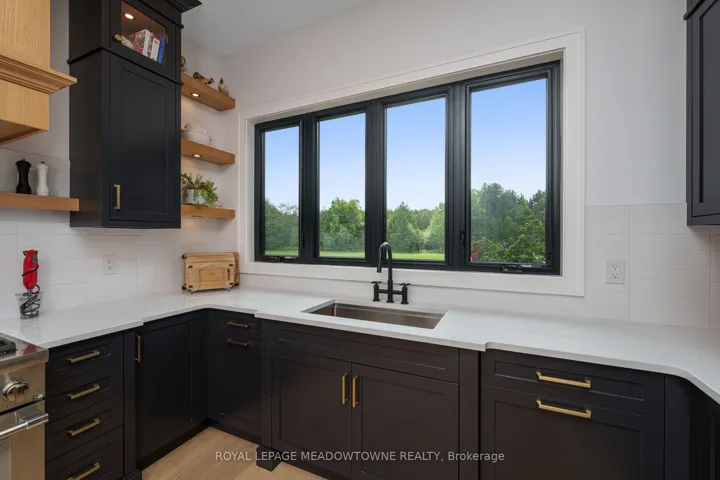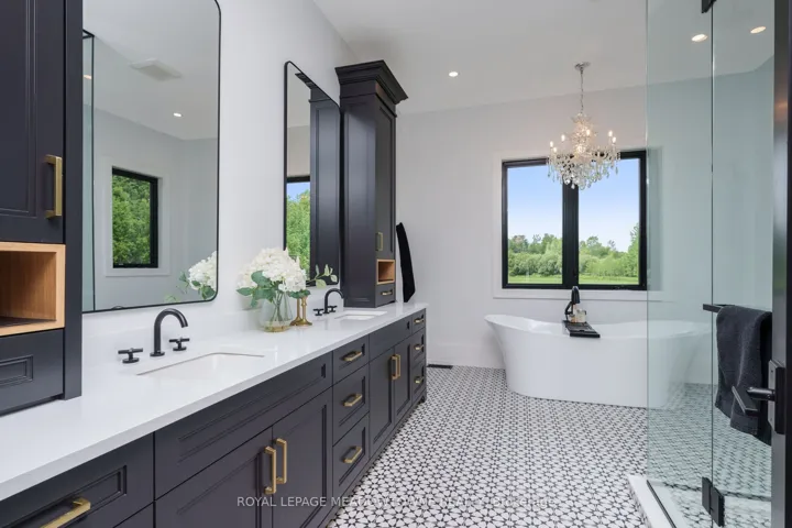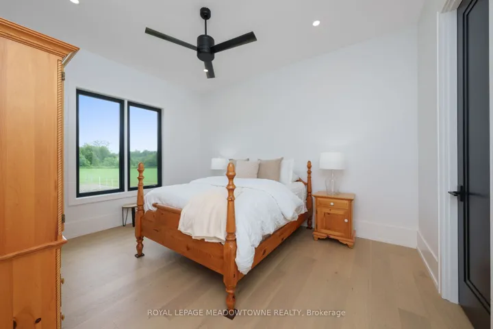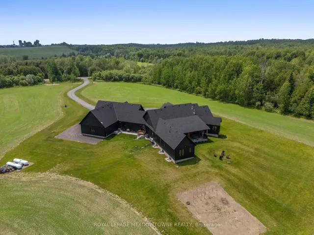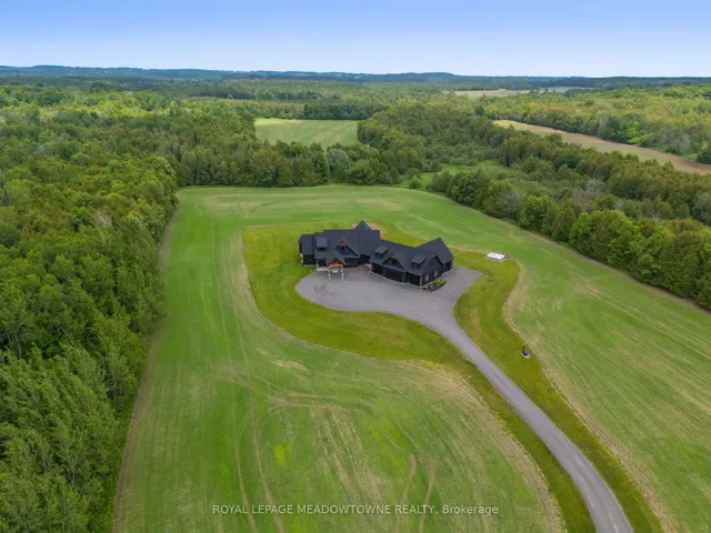 +"PublicRemarks": "Welcome to an exceptional new custom-built Dramatic country estate offering over 9,000 sq.ft. of refined living space, set on 41 acres of private farmland and mature woods-all just one hour north of downtown Oakville, making country living effortlessly accessible. A long, gated private drive sets the tone for this meticulously crafted residence, where quality construction, thoughtful design, and timeless finishes come together. The dramatic great room showcases soaring ceilings, wide-plank white oak flooring, and a statement fireplace, flowing seamlessly into expansive dining and entertaining spaces. Oversized glass doors open to a covered outdoor living area with a second fireplace, creating a true four-season retreat surrounded by uninterrupted countryside views. At the heart of the home, the CHEF -inspired Prep kitchen features top-tier built in appliances, an oversized walk-in pantry, island for prepping and elegant custom finishes, ideal for both everyday living and large-scale entertaining. The primary suite is a private sanctuary with dual walk-in closets, tranquil views, and a spa-like ensuite. Three additional main-floor bedrooms each offer their own luxury ensuite bathrooms, providing comfort and privacy for family and guests alike. The fully finished lower level delivers exceptional versatility-perfect for extended family living, recreation, or entertaining. A separate self-contained one-bedroom Guest Suite with its own entrance adds flexibility for guests, multigenerational living. Completing the property is an impressive 2,500 sq.ft. heated and insulated attached garage/workshop, ideal for car enthusiasts, hobbyists, or entrepreneurs requiring substantial space. This is a rare opportunity to own a newly built, high-quality estate that delivers absolute privacy without sacrificing convenience-an unparalleled blend of craftsmanship, space, and location."