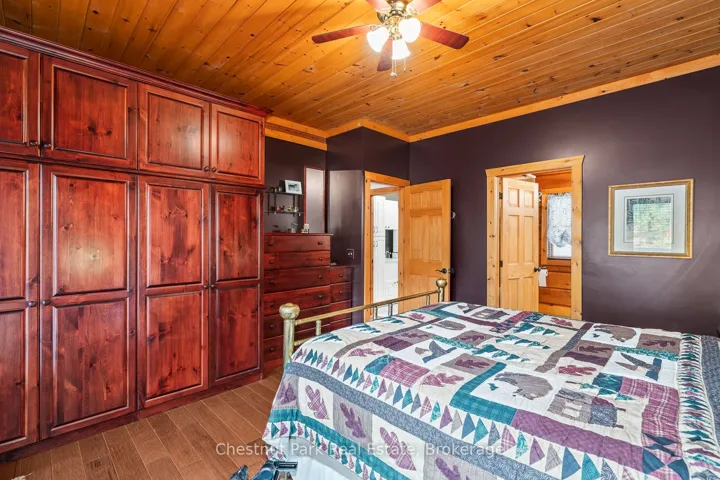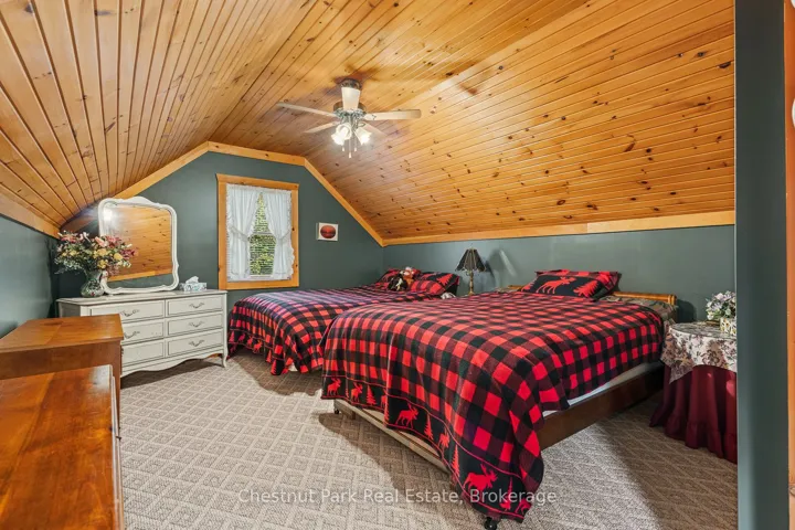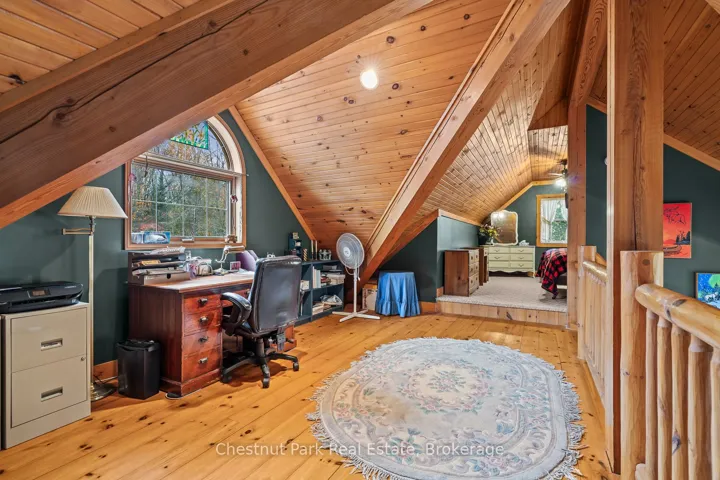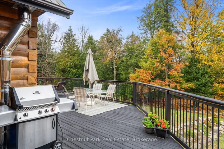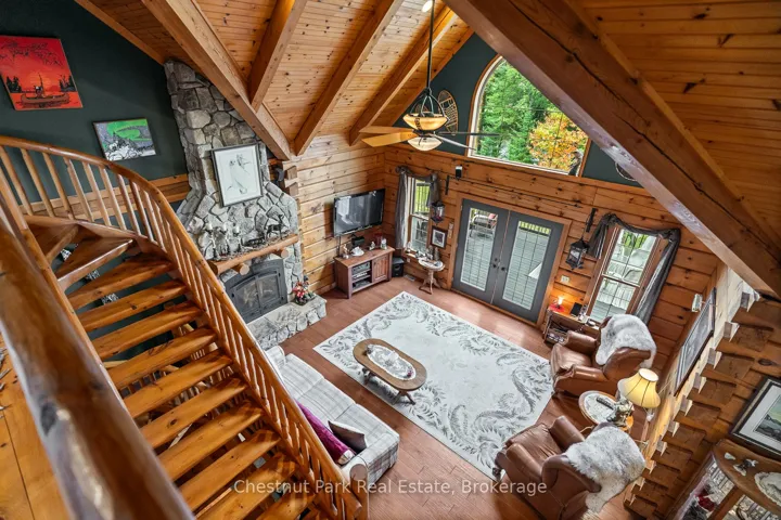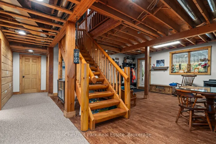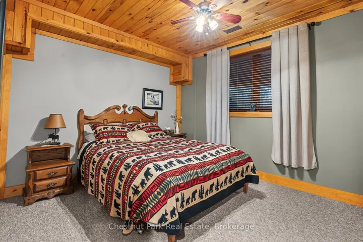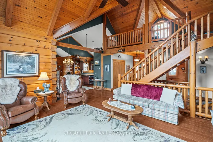 +"PublicRemarks": "Welcome to this one-of-a-kind True North log home, built in 2005 and nestled on just over 9 acres in the unorganized Township of Lount. With 350+ feet of frontage on Maeck Lake, this property blends seclusion, craftsmanship, and natural beauty. Arrive to exceptional curb appeal and the timeless charm of log construction. Beautiful landscaping surrounds the home, featuring man-made waterfalls, a spacious yard for kids or pets, and a treehouse for endless outdoor fun. A detached two-car garage with a second story above, offering ample storage. Inside, pride of ownership shines. The main floor features hardwood floors and a custom crafted, built in cabinetry by Cutters Edge in the Kitchen, Primary Bathroom, and Basement Bathroom, Built in Jenn Air oven, microwave, and Kitchen Aid fridge with Jenn Air gas cooktop, with a Silestone Island countertop. The open-concept living and dining area is warmed by a propane fireplace insert and opens to an expansive deck across the back lakeside, perfect for enjoying peaceful views. A loft overlooks the living room, ideal as an office, creative nook, or extra sleeping area. The main floor also includes laundry and a 3-piece bath with in-floor heat. The primary suite is a true retreat with built-in cabinetry, deck access, and a spa-inspired ensuite featuring an oversized shower and massaging jets. The lower level offers two additional bedrooms, a large rec room with a wood stove, 3-piece bathroom with heated floors and a walkout to a lower deck. Modern comforts include a drilled well, septic, propane heating, and a wired generator. Near the shoreline, a charming bunkie equipped with hydro and propane options. Providing guest space with a bedroom, wash area, loft, wood stove, and propane stove. With a sandy waterfront, private dock, and the freedom of unorganized living, this property is the perfect year-round home or Northern retreat. Over 9 acres of privacy, with trails to explore, 350 feet of waterfront, and endless possibilities!"