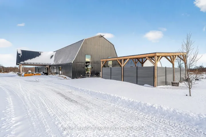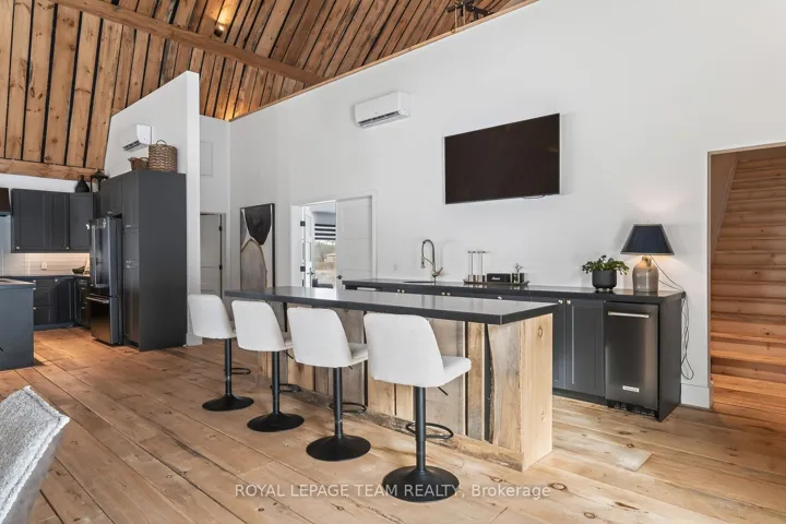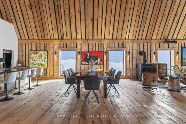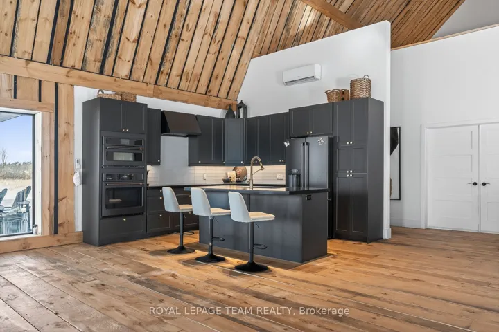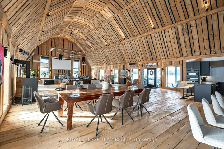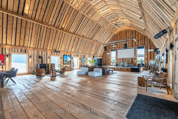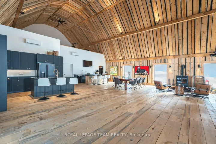 +"PublicRemarks": "Unforgettable! A rare and remarkable barndominium offering monumental scale, moody elegance, and undeniable architectural presence. This extraordinary home reimagines barn chic through contemporary design, featuring a breathtaking Great Room with soaring domed ceiling, rich wood detailing, and dramatic lighting that create a cathedral-like atmosphere. A built-in stage with speakers transforms the space into an entertainer's dream, ideal for live music, gatherings, or celebrations. The kitchen is striking and refined, with sleek black cabinetry, gold hardware, and a large island with farmhouse sink. The Great Room also features a chic bar, wood-burning stove, and oversized garage-style doors for flexible indoor-outdoor flow. For luxurious rest: the main-level primary offers privacy and comfort, while a loft, two additional bedrooms, and beautifully finished full bath complete the upper level. Set on 100 private acres with walking paths, a stunning patio with barrel sauna, hot tub, and statement lighting. A truly once-in-a-lifetime rental opportunity."