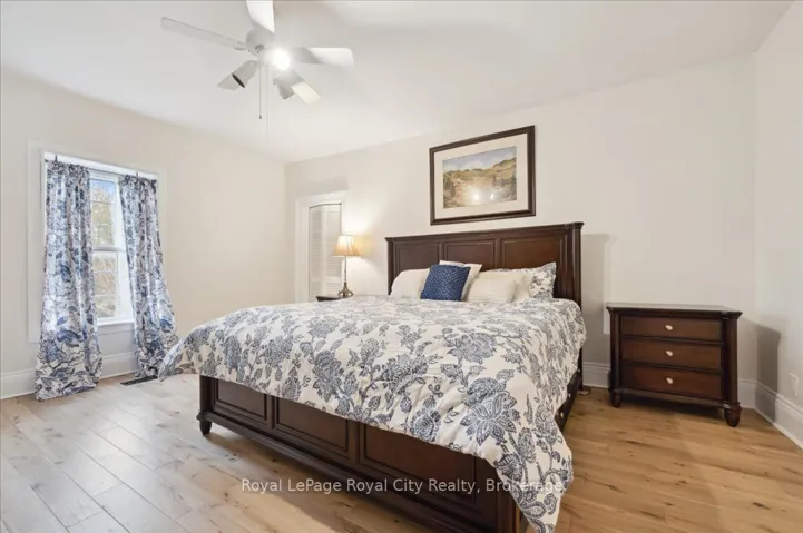 +"PublicRemarks": "BEAUTIFUL ALL BRICK RANCH BUNGALOW STEPS FROM THE SHORES OF LAKE SIMCOE! Set on a private, treed corner lot backing onto forest, this A.N.T. built home offers a peaceful retreat with space, style, and endless potential. Boasting 1,859 SQFT the bright main level is highlighted by 9-foot ceilings, elegant crown moulding, and pot lighting throughout. The open-concept living area has a custom built fireplace and is ideal for both everyday comfort and entertaining, while 3 generously sized bedrooms provide exceptional flexibility. Two primary bedrooms feature ensuite access, creating ideal accommodations for guests or multi-generational living.The heart of the home is the large eat-in kitchen, complete with granite countertops, tiled backsplash, and a sliding glass door walkout to an expansive deck-perfect for summer dining overlooking the private backyard. The extensive basement boasts oversized windows and tall ceilings, presenting a blank canvas for additional living space, recreation, or a future in-law suite. Outside, mature trees surround the property, offering a serene, cottage-like setting while backing onto green space. A landscaped yard with a 24' round above-ground heated pool on the expansive multi level deck has a gazebo and thoughtfully placed lighting to set the stage for evening gatherings. The yard is equipped with a workshop/shed with both a man door and a custom garage door for storage. Enjoy walking or biking with the public trail at the end of the road or enjoy the vibrant Friday Harbour Resort just minutes away. Other Notable Features: Roof (2024 and newer), A/C (2024), Hot Water Tank (2012), Smart Thermostat, Solar panels for pool heater mounted on roof, 200 amp electrical panel. This home is a rare opportunity to enjoy space, privacy, and the outdoors with a close proximity to the lake!"
