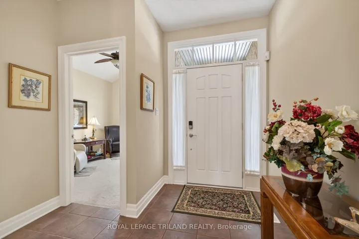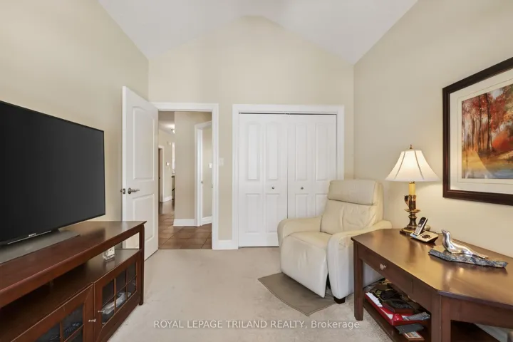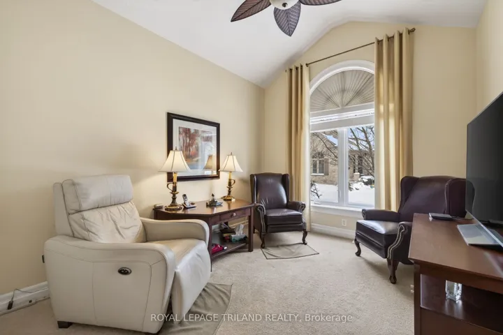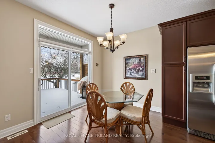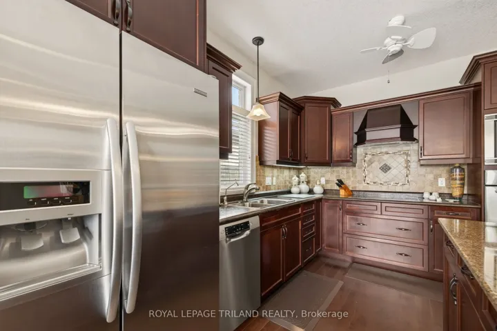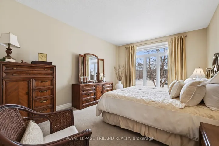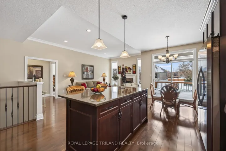+"PublicRemarks": "Pristine 2+2 Bed, 3 Bath, Bungalow-Style Condo Backing Onto Greenspace. Welcome to refined condo living where rich finishes, thoughtful design, and a serene natural backdrop come together beautifully. This immaculate, 2800 sq ft+ bungalow-style condo, is set within the quiet interior of the development, across from the pond and away from the hustle of Col Talbot Rd. The property offers the ease of main-floor living with the bonus of an expansive finished lower level. The sun-filled main level features an open, flowing layout with a well-defined dining area, ideal for hosting. Pristine hardwood floors shine throughout. The chef-inspired kitchen is finished with rich cabinetry, granite island countertop and generous prep space/kitchen island, seamlessly connecting to the living area. Just off the breakfast nook, step out onto a private deck overlooking tranquil greenspace. Mature landscaping provides excellent privacy while still allowing you to enjoy stunning sunset views. A new awning (2025) adds comfort and shade for outdoor dining and relaxing. The spacious primary suite offers a true retreat, complete with a walk-in closet and private ensuite. A second main-floor bedroom-perfect as a guest room, den, or home office-is conveniently located near a stylish 3-piece bathroom off the foyer, and main floor laundry. The lower level expands your living space with two additional bedrooms featuring large windows, a full4-piece bathroom, and a generous family room-perfect for movie nights, hobbies, or hosting visitors. Ample storage in the utility room adds to the home's exceptional functionality. This pristine condo delivers elegant finishes, privacy, and the convenience of one-floor living, complemented by a versatile lower level designed for every stage of life-all set against a peaceful rolling green backdrop. A/C 2025. Owned hot water heater, water softener, air exchange. Enjoy the convenience of a central vacuum, and kitchen garburator."