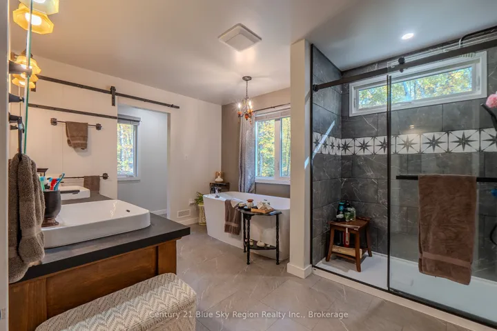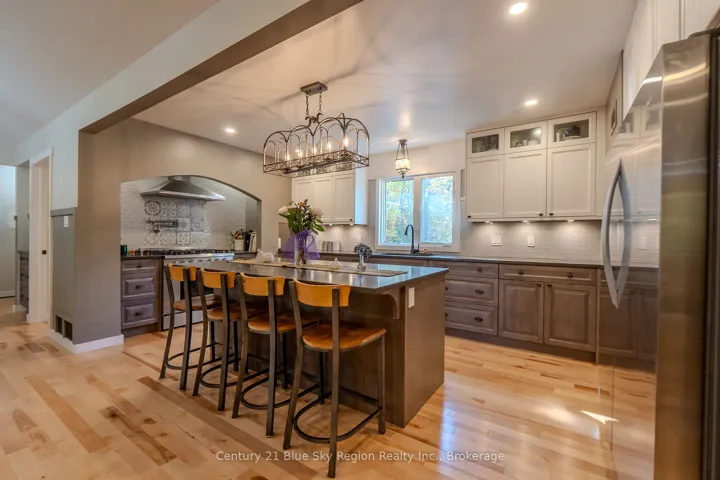 +"PublicRemarks": "Privately set on nearly 10 acres and 400 feet from the road, this craftsman house was created with accessibility and light in mind. Wide hallways, spacious rooms, and 32"+ doorways. The front porch welcomes you into a spacious, tiled entry. Off the entry is a bright bathroom featuring a unique vanity, walk-in shower, toilet, and a barn-style cheater door leading to a large, well-lit bedroom. The great room features a propane fireplace with built-in storage cabinets and a coffee nook. A terrace door welcomes you to a 10X28 deck with a propane hookup for entertaining and BBQ'ing. The open concept kitchen features full-height uppers, a large island, and Silestone countertops, a tiled cooking area boasting a 36" THOR propane range with a pot filler and adjoining prep-pantry with a baker's pass-through to the kitchen. A side-by-side fridge and freezer finish the kitchen. The Master bedroom features a large walk-in shower, a stand-alone tub, double sinks, and a linen closet. The master suite is completed with an impressive walk-in closet. Descend to the walk-out lower level with storage and central vac located under the stairs. A 2-piece marble floor washroom is at the bottom of the stairs next to another storage/workshop area, and a versatile 14'X24' sewing/exercise room. Large windows and a terrace door lead to the rear stone patio. Flexibility is the word with roughed-in plumbing and doorways that allow for a conversion in a granny suite. The lower level includes a large rec room with wiring for recessed speakers. CAT-5 is fed into every TV space to take advantage of the Fiber internet servicing the house. The basement also features a wood fireplace, kitchenette, 2 bedrooms, a large 3-piece bath, and a terrace door to the patio. The home is heated by a high-efficiency furnace with Life Breath HRV and cooled by A/C.A full service generator provides power during outages."
