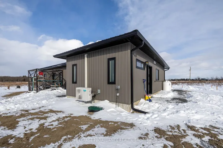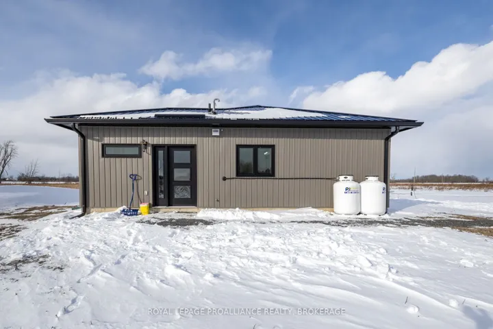 +"PublicRemarks": "Modern Country Living on 25 Acres - Just Minutes from Gananoque. Welcome to the perfect blend of contemporary comfort and peaceful rural living. This recently built, slab-on-grade bungalow sits on a stunning 25-acre property, offering space, privacy, & low-maintenance living - all just 5 minutes east of the town of Gananoque & approximately 30 minutes from downtown Kingston. Step inside to a bright, open-concept home featuring laminate flooring throughout (completely carpet-free) with tile in the bathrooms, all warmed by in-floor radiant heating for year-round comfort. The heart of the home is a stylish modern kitchen designed for both everyday living entertaining. You'll love the quartz countertops, elegant tile backsplash, slow close cupboard drawers & large center island, plus a full set of new LG appliances included. The spacious primary bedroom retreat offers a beautifully finished ensuite with, double sinks, quartz countertops, custom tiled shower with sliding glass door. From the ensuite, you'll appreciate the smart layout leading directly into a convenient & functional shared laundry room & walk-in closet. Two additional generously sized bedrooms provide flexibility for family, guests, or office/gym space, with one featuring a door to the side yard for private access. The second bathroom is equally impressive, showcasing a pocket door, quartz counters, & a stylish freestanding tub. This home also features A/C, a storage shed & 9000 recently planted trees. Built for easy ownership, the home exterior features board & batten-style vinyl siding & a durable metal roof, ensuring long-term, low-maintenance living. If you've been searching for modern finishes, efficient design, & acreage close to town - this property delivers it all."