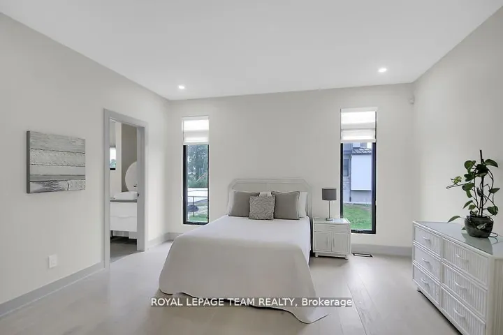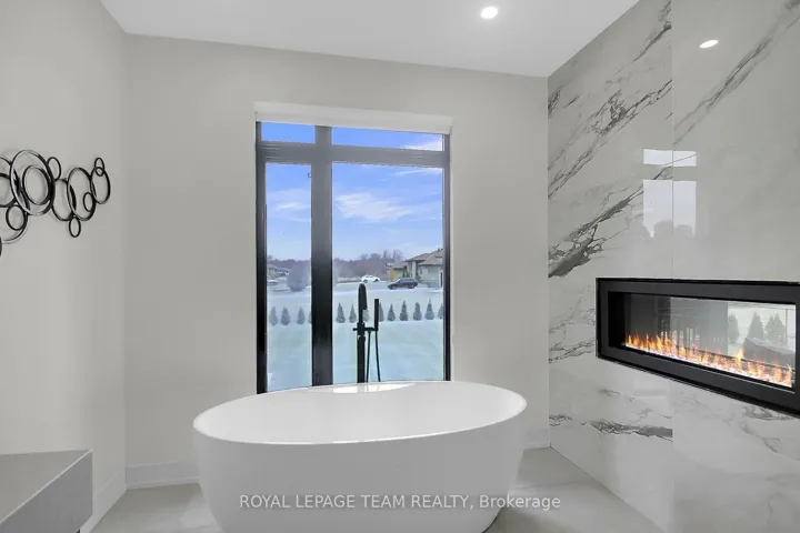 +"PublicRemarks": "This expansive custom-built bungalow offers 6 bedrooms and 5 bathrooms, showcasing elegant wide plank oak hardwood flooring, oversized windows, and exquisite craftsmanship throughout. Designed with modern living in mind, the open-concept layout welcomes you through a stylish foyer into a grand living room that seamlessly extends to a covered veranda, complete with a cozy wood-burning fireplace. The chef-inspired kitchen is a true centrepiece, featuring a stunning waterfall quartz island with generous seating, quartz backsplash, gas cooktop, and a bright breakfast nook perfectly complemented by a separate formal dining room for more refined gatherings.The luxurious primary suite is a private retreat, boasting a spacious walk-in closet with custom vanity, a 5-piece ensuite with double sinks, a glass-enclosed shower, freestanding soaker tub, and a gas fireplace for added comfort. Three additional bedrooms are located on the main floor, two of which offer private en-suites. The fully finished lower level features heated floors throughout, three large bedrooms, a full bathroom, and a vast recreational space with endless potential for entertainment or relaxation. Additional highlights include a heated 3-car attached garage with soaring 20-ft ceilings and a fully integrated smart home system with wireless control and state-of-the-art 5-zone wireless speakers. Please note that lower level rooms have been virtually staged."