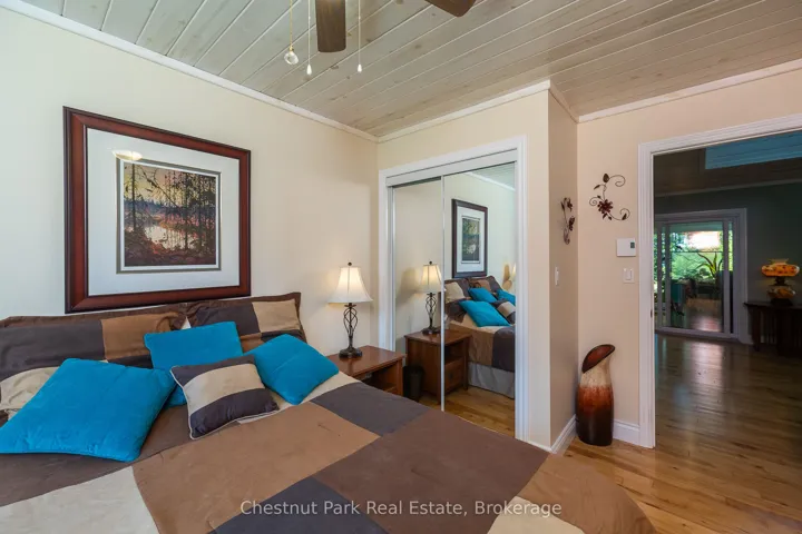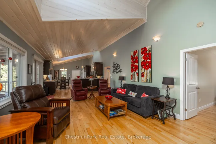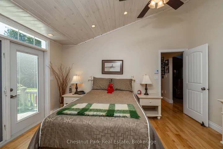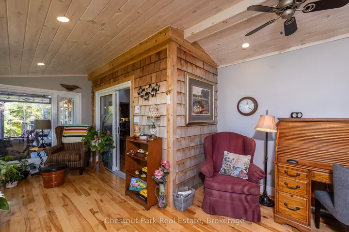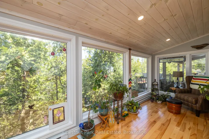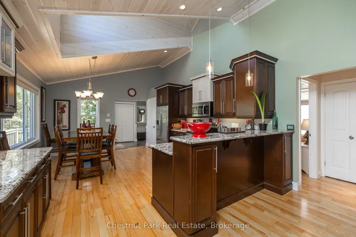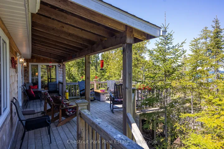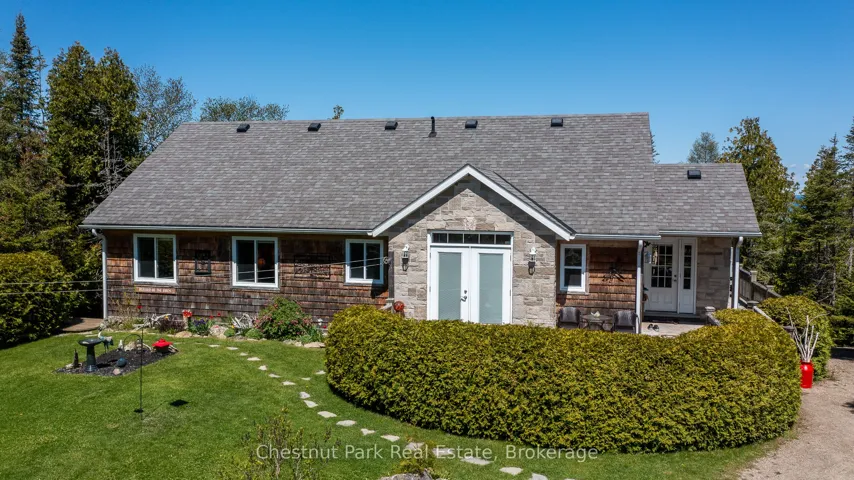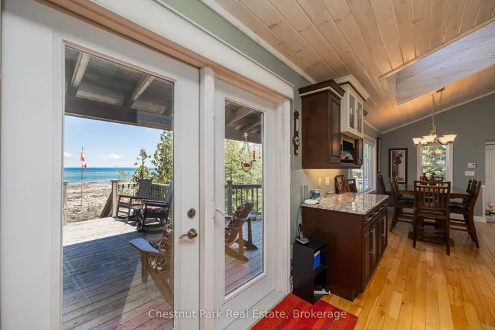 +"PublicRemarks": "Peaceful Waterfront Living Near Tobermory. Welcome to this private, year-round 3-bedroom, 2-bathroom waterfront residence where comfort meets natural beauty. Perfectly positioned along a picturesque shoreline, the home captures stunning lake views from most rooms, while the expansive wraparound deck invites you to soak in colourful sunsets, enjoy morning coffee, or unwind beneath star-filled skies. Inside, the bright open-concept design showcases soaring vaulted wood ceilings, sun-filled dormer windows, warm maple hardwood floors, and a striking gas fireplace that anchors the inviting living space. The well-appointed kitchen offers granite countertops, stainless steel appliances, and rich cabinetry-ideal for both everyday living and entertaining. A separate four-season sunroom provides a quiet retreat for a home office, hobby space, or relaxing lounge. The primary bedroom features deck access, a spacious walk-in closet, and a beautifully finished marble-tiled ensuite. Practical highlights include main-floor laundry, central vacuum, full backup generator power, and a detached garage complete with water hookup. Mature perennial gardens surround the home, creating a serene and private setting, all just minutes from the shops, restaurants, and harbour of the charming village of Tobermory."