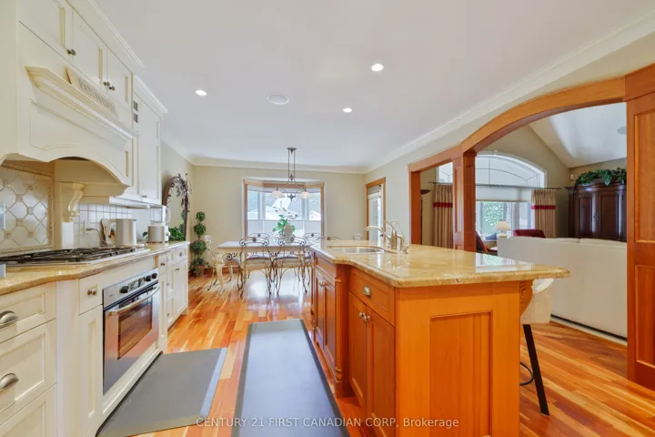 +"PublicRemarks": "Located in the prestigious Sunningdale area of North London. Originally built as Bruce Mc Millian's model home offering many unique design elements rarely seen in homes of this caliber. Attractive curb appeal with professional landscaped gardens complete with irrigation system. The flagstone covered porch greets you as you enter into the warm and inviting interiors. The large main floor den features a custom wood ceiling treatment, a spacious formal dining room with separate wet bar for elegant entertaining. The open design great room with vaulted ceilings and custom fireplace overlooks into the enclosed tiled and screened in sunroom and patio to enjoy summer evenings. Built in speakers are integrated throughout the home. A european inspired kitchen with custom cabinetry, granite counters and island with breakfast area overlooks the massive great room. Walk-in pantry and heated flooring in the mud room, main floor laundry room and lower level bathroom. Enter into the main floor primary bedroom with it's own custom brick walled foyer and ceiling treatment adds to it's tranquility. There is also a main floor guest room that is ideal for multi-generational living. Upstairs you will find 2 additional bedrooms with a jack and jill bathroom and very large walk-in closets plus a cozy book library overlooking the great room and foyer. In the lower level you will love the separate theatre room with built in speakers with media equipment included, billiard and games room, exercise room, additional bedroom or office space, cold room plus an incredible amount of storage area. Shingles, furnace and central air have been updated within the last 3-4 years. This luxury home exudes warmth along with spacious interior spaces ideal for today's lifestyle!"