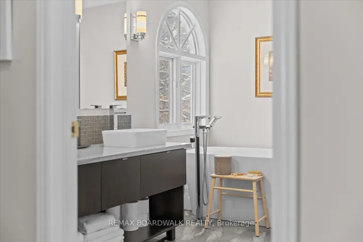 +"PublicRemarks": "Prestigious 4+1 bedroom home w/pie-shaped rear yard backing onto ravine, twin garage doors, multiple roof peaks, curved transom windows, brick front exterior, interlock walkway, covered front entrance, modern front door w/vertical transom, foyer w/ceramic tile & closet, high baseboards, Victoria-style open hardwood staircase & 2-storey high ceiling, living room w/vaulted ceilings, wide-plank hardwood flooring & oversized windows, dining room w/ravine views & butler doors, stylish centre-island kitchen w/granite countertops, recessed sink, pot drawers, marble backsplash, detailed upper and lower mouldings, custom hood-fan, built-in oven & microwave, 4 x burner induction cooktop, deep 24-inch pantry w/pull-out shelving, eating area w/panoramic windows & twin garden doors onto elevated entertainment-sized deck, sunken family room w/pot lighting & wood-burning fireplace framed in marble, open main-floor den w/glass doors & California shutters, 2-pc powder room, main-floor laundry room w/soaker sink & side-door entrance, 2nd level landing w/hardwood, mezzanine railings & linen closet, primary bedroom retreat w/French doors, multiple windows, soft pot lighting, updated spa-style ensuite w/double raised boxed sinks & waterfall taps, quartz-topped vanity, oversized ceramic tile flooring, double-wide glass shower w/rain head and European faucet, stand alone soaker tub positioned w/serene ravine views, deep double-sided walk-in closet, 3 x additional bedrooms w/generous closet space, 4-pc main bathroom w/extra linen storage & window bench seat, straight staircase to multifunctional recreation room w/9-ft high ceilings, twin oversized chest-height windows, coffered ceiling, pot lighting, gas fireplace & entertainment bar, 5th bedroom w/double closets, 3-pc bathroom w/stand-up shower, exercise room w/seasonal closet, storage room w/built-in shelving, rear yard framed by mature trees & side fencing, 2x car garage w/inside access, 24 Hour Irrevocable on Offers"