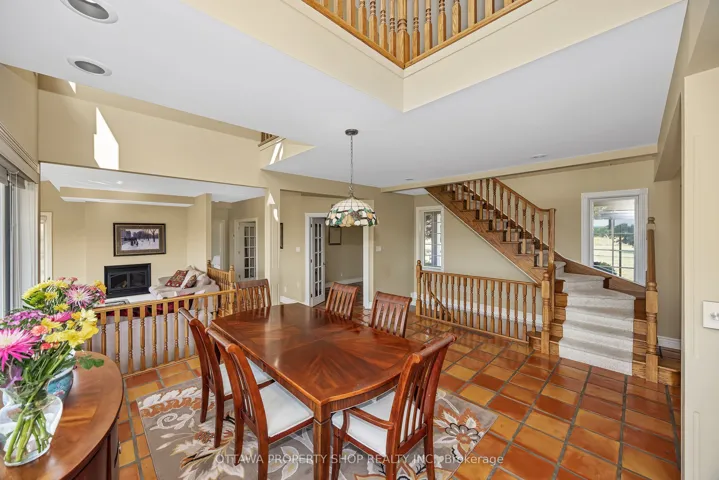 +"PublicRemarks": "Offering breathtaking views, spectacular sunsets, mature trees, a winding approach, and extensive landscaping, this attractive residence captures the best of both worlds: the seclusion of the country, yet just minutes to the conveniences of Kanata and Ottawa all with the luxury of fiber-optic internet in the countryside. Set on 25.55 acres, this extraordinary estate blends privacy, elegance, and modern comfort. The impressive approximately 4,700 sq. ft. home showcases timeless architectural details, abundant natural light, and a thoughtful layout. At the heart of the home is a gourmet kitchen, thoughtfully designed with maple cabinetry accented by crown molding, sleek Corian countertops, glass-front cabinets, and a center island with breakfast bar. Smart features such as a microwave sling, lazy Susan, desk nook, bread pantry box, and extensive storage solutions enhance both function and style. The main level also features elegant double French doors, expansive principal rooms, and a cathedral-ceiling primary suite with extensive closets and a spa-inspired ensuite with double vanity, oversized shower, and tiled floors. Upstairs, two staircases lead to three generously sized bedrooms, each enhanced by vaulted ceilings, Palladian windows, and balcony access with sweeping views of the property. The walk-out lower level extends living space with a recreation room, games area, hobby room, office/den a full bath with oversized shower, and ample storage. Patio doors open to a 20 x 30 interlock stone terrace, seamlessly connecting indoor and outdoor living."