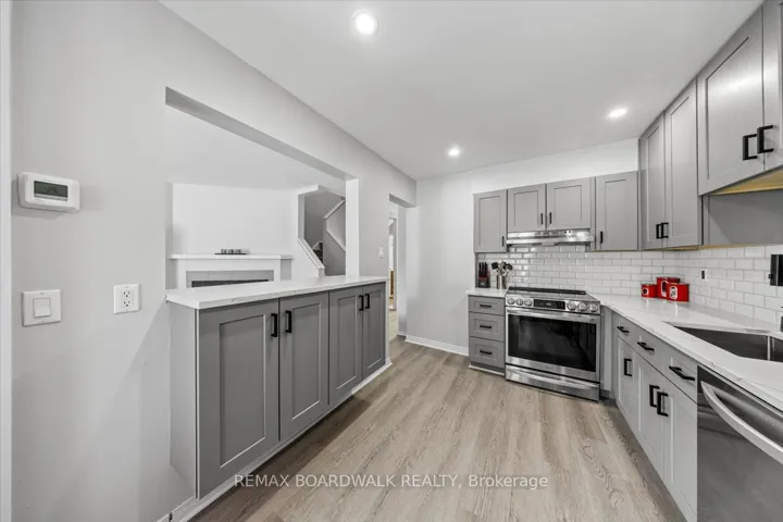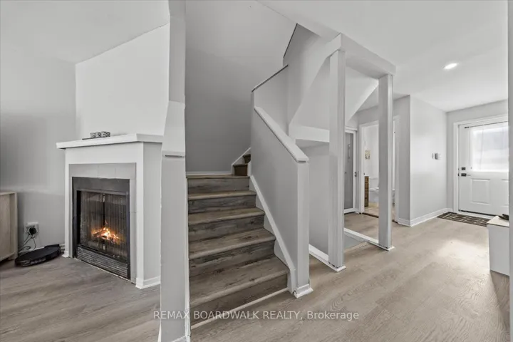 +"PublicRemarks": "Welcome to this 3-bedroom, 2-bath condo townhouse located in the highly sought-after Fallingbrook community. Close to parks, schools, and convenient transit.The main level features laminated flooring throughout, a welcoming front entrance with a closet, and a convenient powder room. The bright L-shaped living and dining area features a cozy wood-burning fireplace, a large bay window, and ample space for entertaining.The updated kitchen is a standout, complete with quartz countertops, stainless steel appliances, and a centre island with additional cabinetry. Perfect for both everyday living and hosting. Step outside to your private deck with no direct rear neighbours, offering added privacy and a peaceful outdoor retreat.Upstairs, the spacious primary bedroom features dual walk-in closets, a separate vanity with sink, and an updated cheater ensuite bathroom. Two additional bedrooms complete the upper level.The finished basement provides a large recreation room, ideal for a home office, gym, or family space, along with plenty of storage. Enjoy the convenience of inside access to the single-car garage, plus ample visitor parking throughout the community.Residents also enjoy access to an in-ground pool and clubhouse, perfect for summer enjoyment. A wonderful opportunity to put your own touch on a home in a great location, nestled in a family-friendly community close to parks, schools, and transit. Furnace, A/C ($125/per mth)"