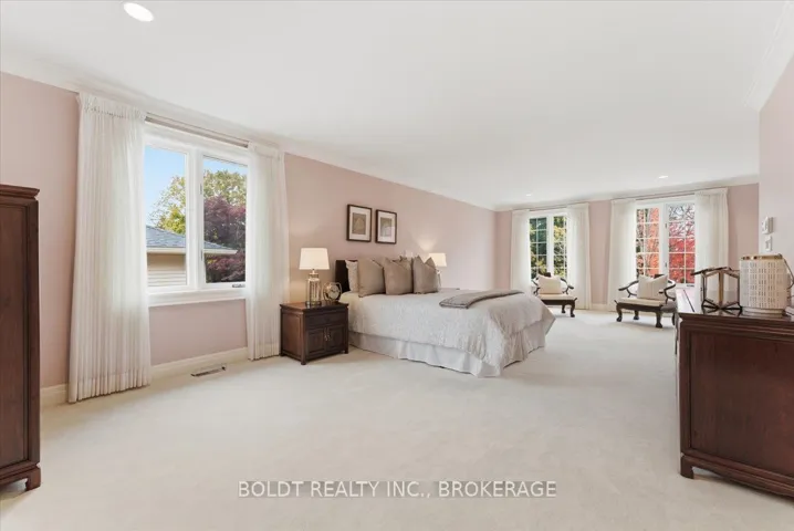 +"PublicRemarks": "Exquisite Executive Home in Prestigious St. George's Point! Nestled in one of St. Catharines' most desirable & upscale neighbourhoods, this exceptional solid brick 2 storey with views to Martindale Pond, offers 4200 sqft of luxurious finished living space above grade. St. George's Point is known for its natural beauty, privacy & architectural character, ideal for those who value quality craftsmanship & tranquility while remaining close to city conveniences. A grand foyer with a serene Zen Garden & floating staircase sets the tone for the refined interior, featuring pristine marble, solid oak doors, oak hardwood floors, plaster crown molding & elegant Kohler fixtures throughout. The main level includes a formal LR & DR with Shoji screens, a spacious family room w/wood-burning FP, a home office w/waiting area, 2pce powder room & laundry w/sink & storage. The impressive eat-in kitchen boasts built-in appliances, an abundance of cherrywood cabinetry, a centre island w/breakfast bar & bright dining area with patio doors leading to a wood deck & fully fenced yard equipped with gas line for BBQ or fireplace. Upstairs, a curved walkway overlooks the main floor & leads to four spacious bedrms. Two share ensuite privileges to a 4pce bath; another offers a private ensuite & walk-in closet. The stunning primary suite features double oak drs, sitting area, a generous walk-in closet w/built-ins & a luxurious 6pce ensuite with jacuzzi tub, walk-in shower, double sinks, bidet & gleaming marble. The partially finished lower level offers in-law potential with a separate entrance, rough-in for kitchen, framed & insulated rooms, a 3pce bath, hot tub with ceramic surround, cold storage and abundant space for future finishing. Additional highlights include 200-amp electrical, newer furnace & hot water heater (2021). Attached triple-car garage w/inside entry & private interlock driveway with parking for 5 cars. Pride of ownership shines throughout this magnificent home-truly a must-see!"