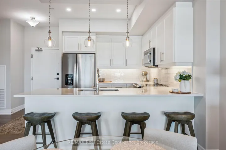 +"PublicRemarks": "Set high above Guelph's vibrant south-end this suite showcases impressive 941sqft, 1-bdrm + den where modern elegance meets breathtaking views! Bathed in natural light this unit captures sweeping vistas of treetops & city skyline offering serene backdrop for everyday living. At this price point it offers exceptional value per sqft in one of Guelph's desirable neighbourhoods. Designed W/upscale finishes this modern suite exudes comfort & sophistication. Soaring ceilings & wide-plank engineered hardwood create airy ambience that flows seamlessly through the open-concept living space. Relax by fireplace in living room or step onto private balcony-ideal spot to sip morning coffee or unwind & take in city views. Gourmet kitchen W/white cabinetry, quartz counters, backsplash & S/S appliances. Oversized breakfast bar W/pendant lighting invites casual dining & entertaining. Primary bdrm W/floor-to-ceiling windows deliver breathtaking vistas. Luxurious 4pc bath W/oversized vanity, quartz counters & soaker tub surrounded by marble-inspired tile. French doors reveal versatile den-ideal as home office, guest room or creative studio. W/I closet in entryway & pantry off dining area keep everything organized & within reach. Live, work & play without leaving home! Residents enjoy amenities: state-of-the-art fitness, golf simulator lounge W/bar, social spaces W/kitchen, billiards, lounge seating & outdoor terrace. Underground parking for yr-round convenience! For parents of U of G students this suite is a smart alternative to renting. Invest in an appreciating asset 10-min from campus W/direct bus access. 24/7 on-site mgmt & controlled entry, you'll have peace of mind knowing your child is living safely while your investment grows in value. Steps to Pergola Commons for access to groceries, restaurants & shops. Quick access to 401 for commuters. Whether you're picking up produce, meeting friends for dinner or exploring parks & trails, this neighbourhood has it all!"