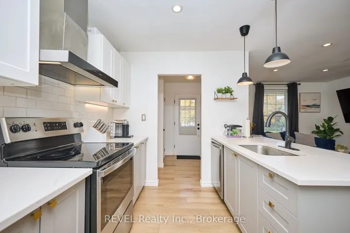 +"PublicRemarks": "Client Remarks Welcome to this fully updated bungalow located in a quiet family friendly desirable north end location on a quiet dead end Crescent, close to A+ schools, highways, Niagara College, YMCA, and more! This fully updated bungalow is move in ready, with just under 2000 sq.ft of total finished living space top to bottom, featuring an open concept design and modern contemporary decor. Modern custom kitchen with new shaker style cabinets, quartz counters, stainless steel appliances, classic subway tile backsplash with island for bonus seating. There is a family sized living room/dining combo with patio doors leading you to the large rear yard with interlock brick patio to enjoy some peace & privacy. Three spacious bedrooms on the main floor with a custom main level bath with custom ceramic tub surround. The lower level features a separate entrance from the backyard for in-law suite, or extra income possibilities if desired.. Large Recroom to fit all the families needs, gas fireplace, a 4th bedroom and a second 4 piece bath with laundry. Deep oversized detached garage with hydro, this bungalow has it all at this price point! Other features and updates include; Garage roof (2025) Double wide Asphalt driveway (2023) Luxury vinyl flooring throughout both levels (2023) Roof/Facia/Soffit/Eaves (2021) Furnace/A/C, & Windows all replaced in (2021). 200 amp service, hydro in garage. All this on a large reverse pie shape Lot with truly nothing to do but move in and enjoy!"