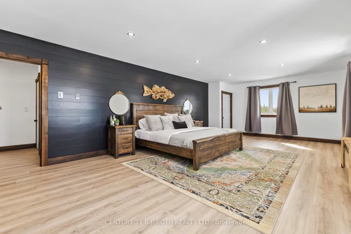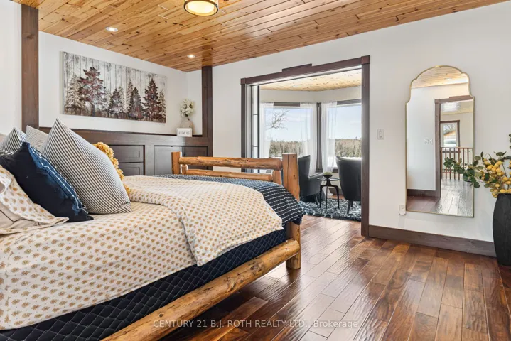 +"PublicRemarks": "An exceptional west-facing waterfront estate on Lake Manitouwabing, set on nearly 5 acres with 521 feet of pristine shoreline and stunning sunset views across a quiet, sheltered bay. Positioned well away from boat traffic and road noise, the property offers outstanding privacy with direct access to one of the area's most desirable lakes.The residence features 3+2 bedrooms and three elegant bathrooms, including a spacious 27' x 15' waterfront primary suite with spa-inspired amenities such as a double shower and soaking tub. The open-concept living space showcases vaulted wood ceilings, hand-scraped flooring, and striking floor-to-ceiling stone fireplaces.A chef's kitchen with high-end stainless-steel appliances is ideal for entertaining. Outdoor highlights include a granite waterfront patio, fire pit, deep-water dock for swimming and boating, and a relaxing hot tub. A substantial 2,000 sq. ft. detached garage/workshop provides excellent storage and versatility."