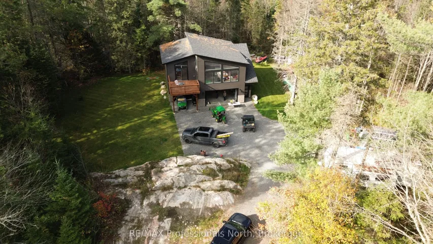 +"PublicRemarks": "Built in 2023, this beautifully crafted home blends contemporary design with the peaceful charm of a forest setting. Nestled among the trees on a private one-acre lot, it offers the perfect balance of comfort, style, and practicality - just 30 minutes from Huntsville. Step inside to an inviting open-concept living space featuring soaring cathedral ceilings, energy-efficient pot lighting, and large windows that frame tranquil views of nature. The kitchen is a chefs dream, equipped with a professional Wolf range and generous counter space for entertaining or everyday cooking. With two spacious bedrooms and two full bathrooms, each with its own large walk-in shower, the layout combines functionality with luxury. An extra-wide staircase easily accommodates a chair-lift, ensuring accessibility for all. The home's thoughtful features continue with a huge three-car garage, complete with in-floor heating, battery-backup garage door openers that can be operated remotely, and a full Generac generator for peace of mind. The main living level is warmed by efficient forced-air heating and air conditioning can be easily added for year-round comfort. Enjoy morning coffee or evening sunsets from the expansive decks at both the front and rear, surrounded by the quiet beauty of the forest. If you've been searching for a modern, energy-smart home with privacy, practicality, and just the right touch of luxury - this one checks every box. BONUS: part of the garage can be converted into an inlaw suite (roughed in)! This property is ideal for those who are interested in the outdoors. It is across from the OFC D trail and ATV trail."