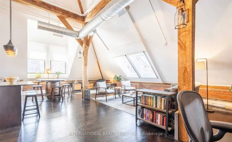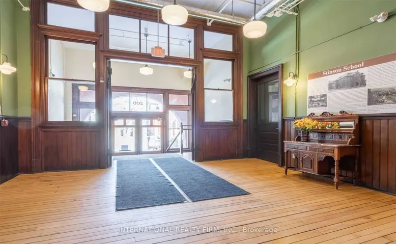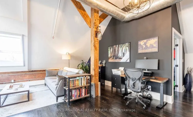 +"PublicRemarks": "Experience the drama of true hard-loft living in PH16 at the iconic Stinson School. This isn't just a condo; it is 1,688 sq ft of architectural history. You are immediately greeted by soaring 20-foot ceilings, original exposed brick, and massive skylights that flood the space with natural light. The main floor is an entertainer's dream with rustic timber beams and warm hardwood floors. Upstairs, the layout separates "living" from "resting" with a dedicated executive den featuring a cozy fireplace-perfect for a home office. The primary retreat offers a massive walk-in closet and a spa-inspired 5pc ensuite. South-west facing, you get breathtaking sunset views over the Escarpment and city skyline. Walkable to the GO Centre and hospitals. This is a trophy property-don't miss it."
